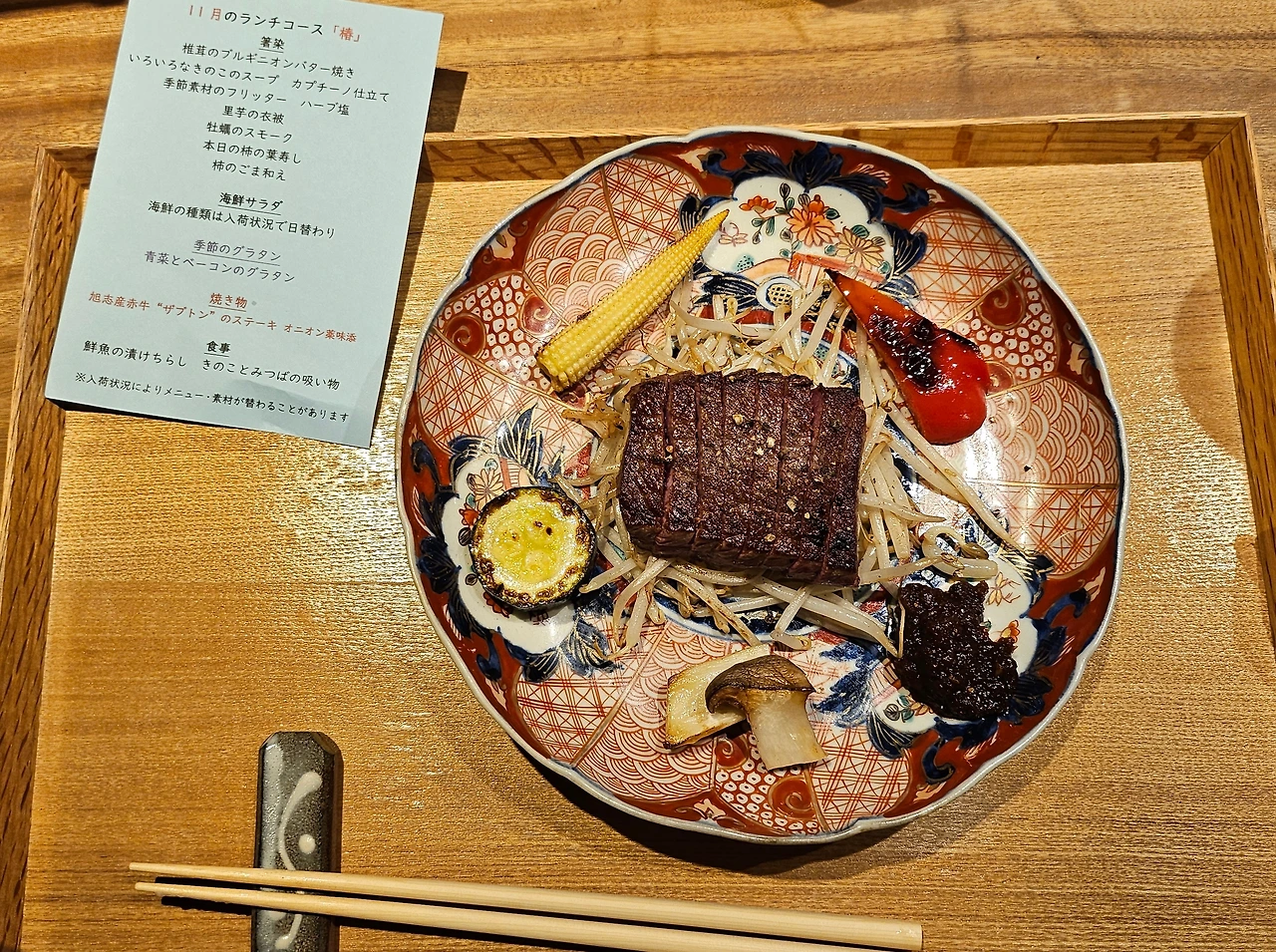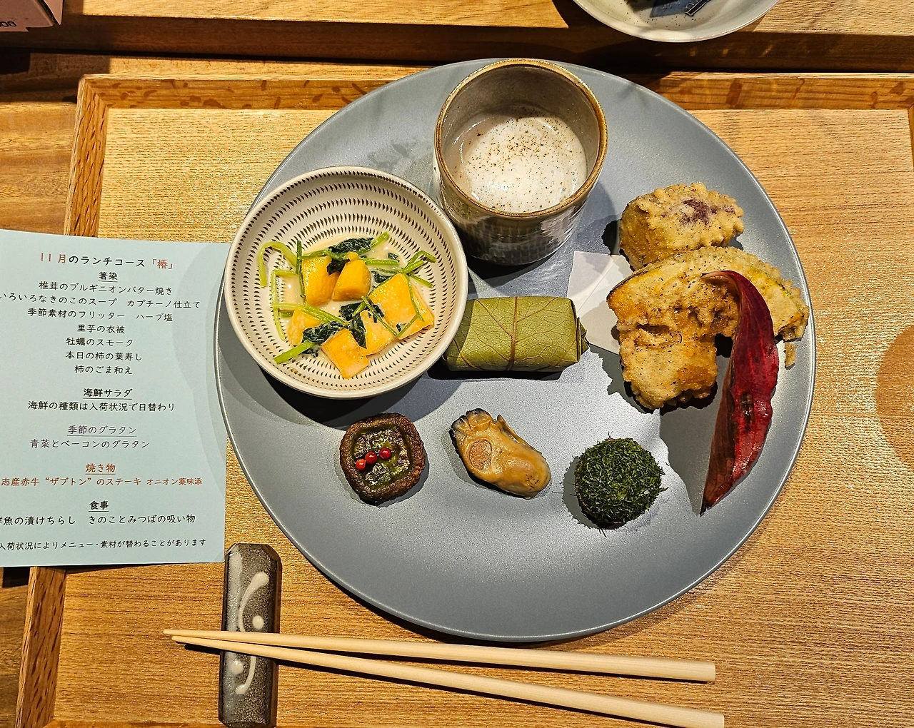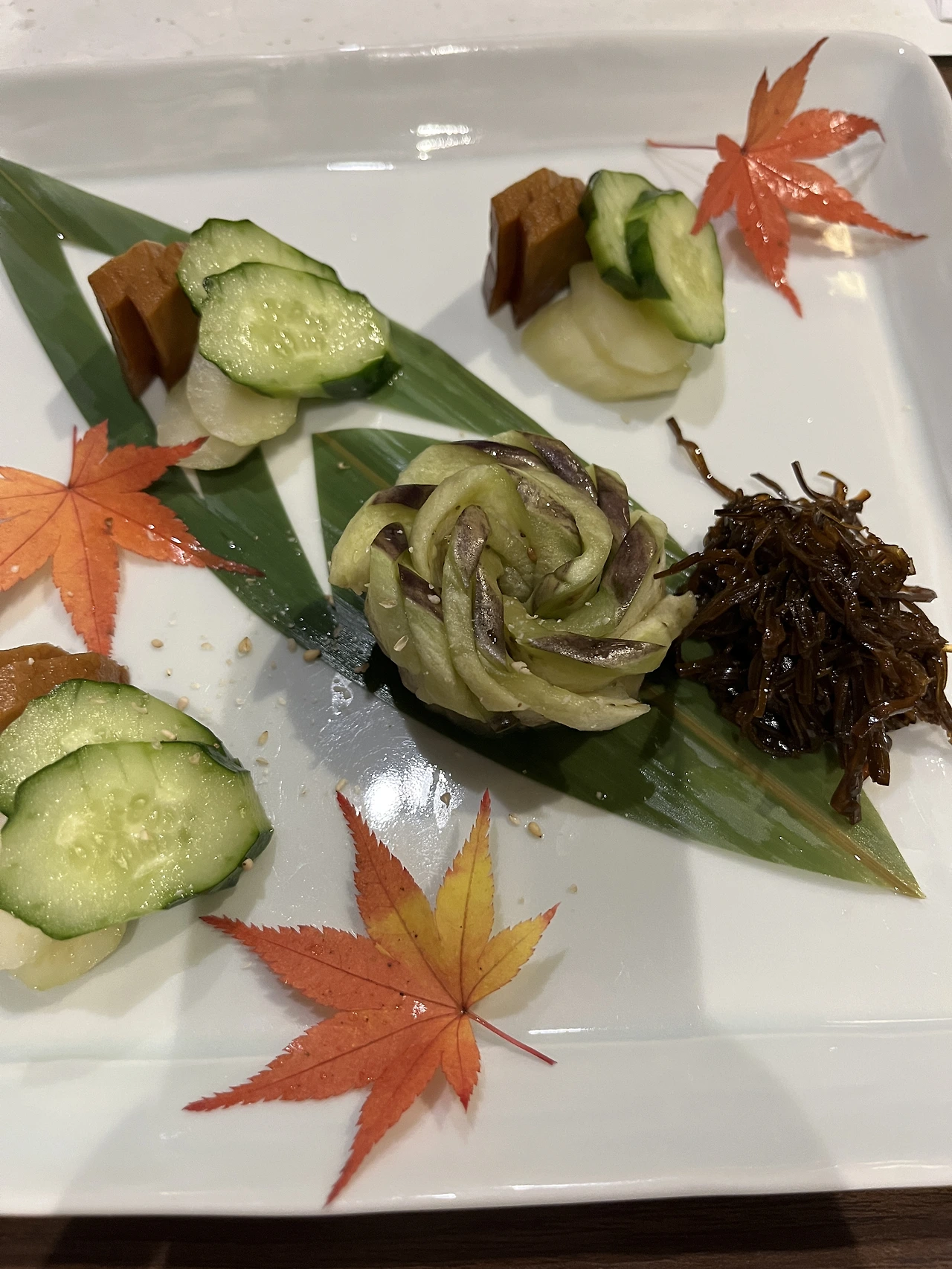 추가비용을 더 내니 주방장은 제철 나뭇잎과 과일 등으로 데코레이션을 하여 멋지게 한 접시를 내놓았다.