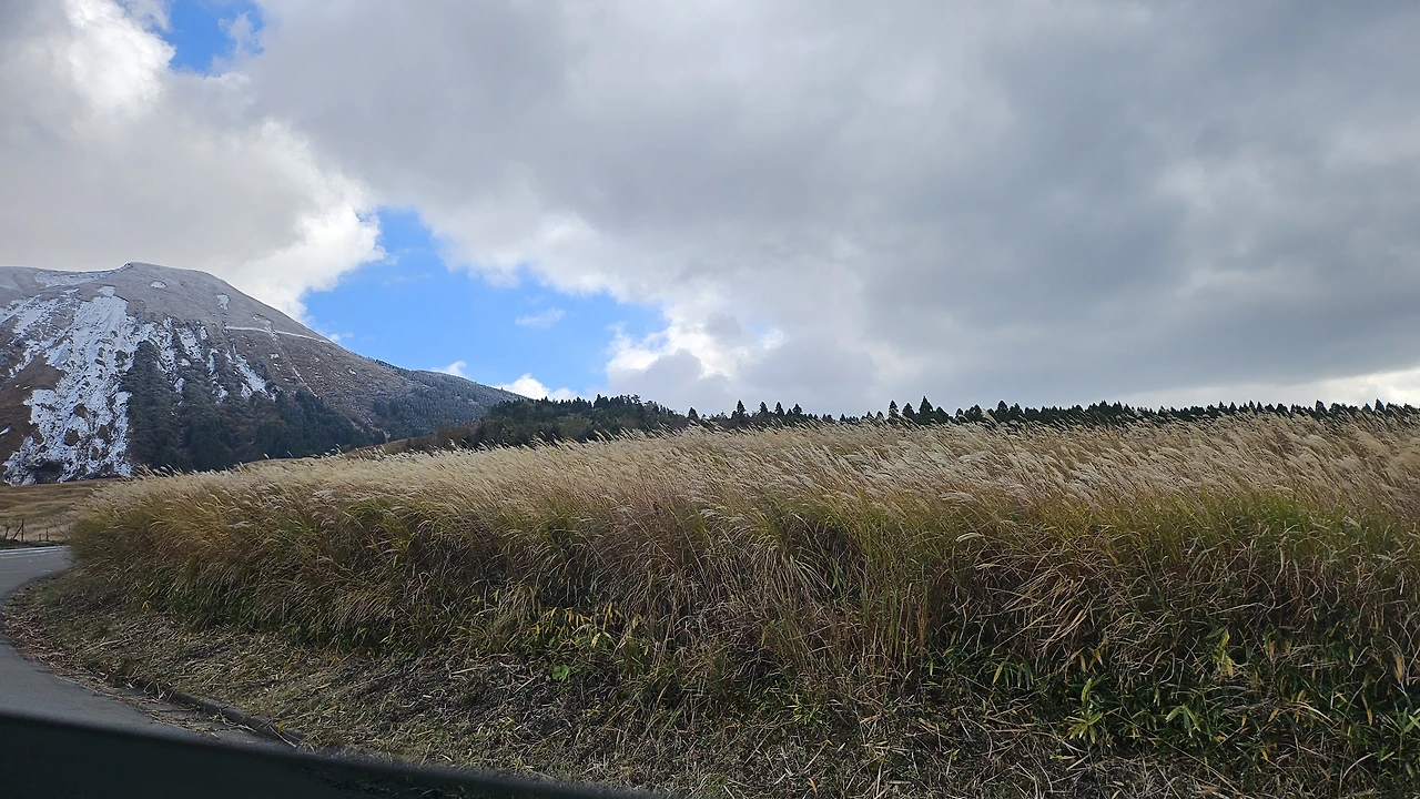 멀리 아소산 분화구가 보이는 곳에 차를 세우고 봉우리들을 구경했다,