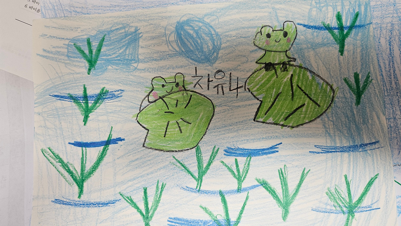 연못으로 분홍 개구리와 노랑 개구리가 소풍을 갔습니다.