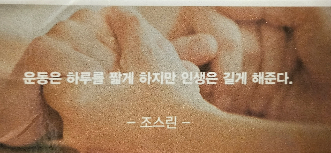 체육관에 도착해서 졸린 눈을 비비면서 운동기구에 앉아 잠을 깨려고 노력하다 보면 거울 앞에 붙어 있는 포스터에 ‘운동은 하루를 짧게 하지만, 인생을 길게 해 준다.’라고 쓰여 있는 표어가 눈에 띈다.