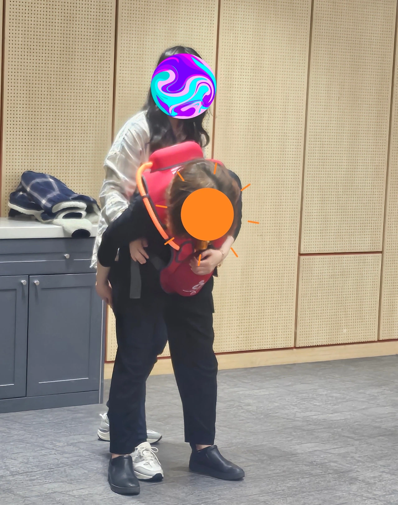 강의 장소에 도착을 하니 주황색 조끼를 입은 강사팀들이 출석체크를 하고, 초록색 스티커를 소매에 붙여 준다.