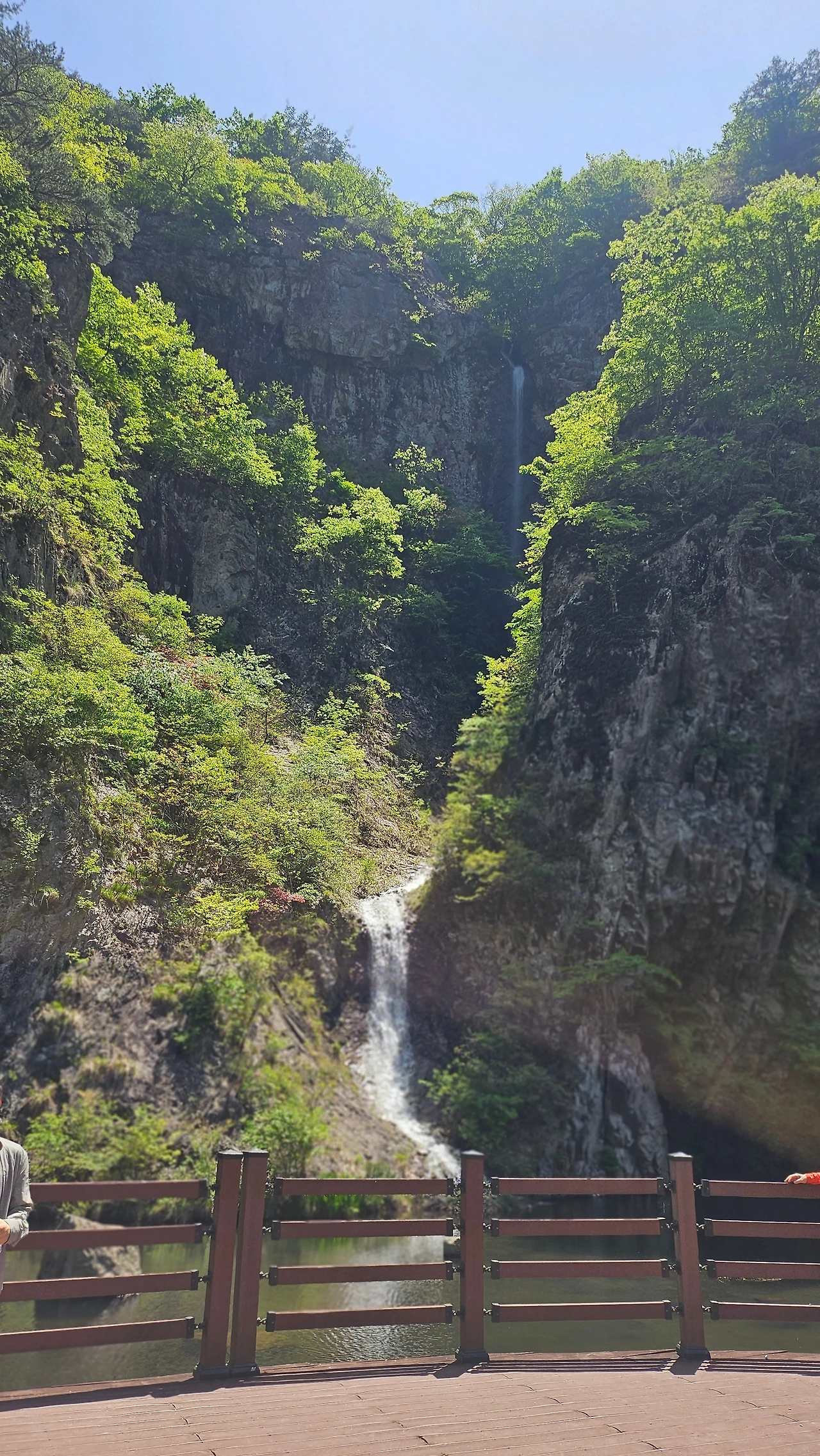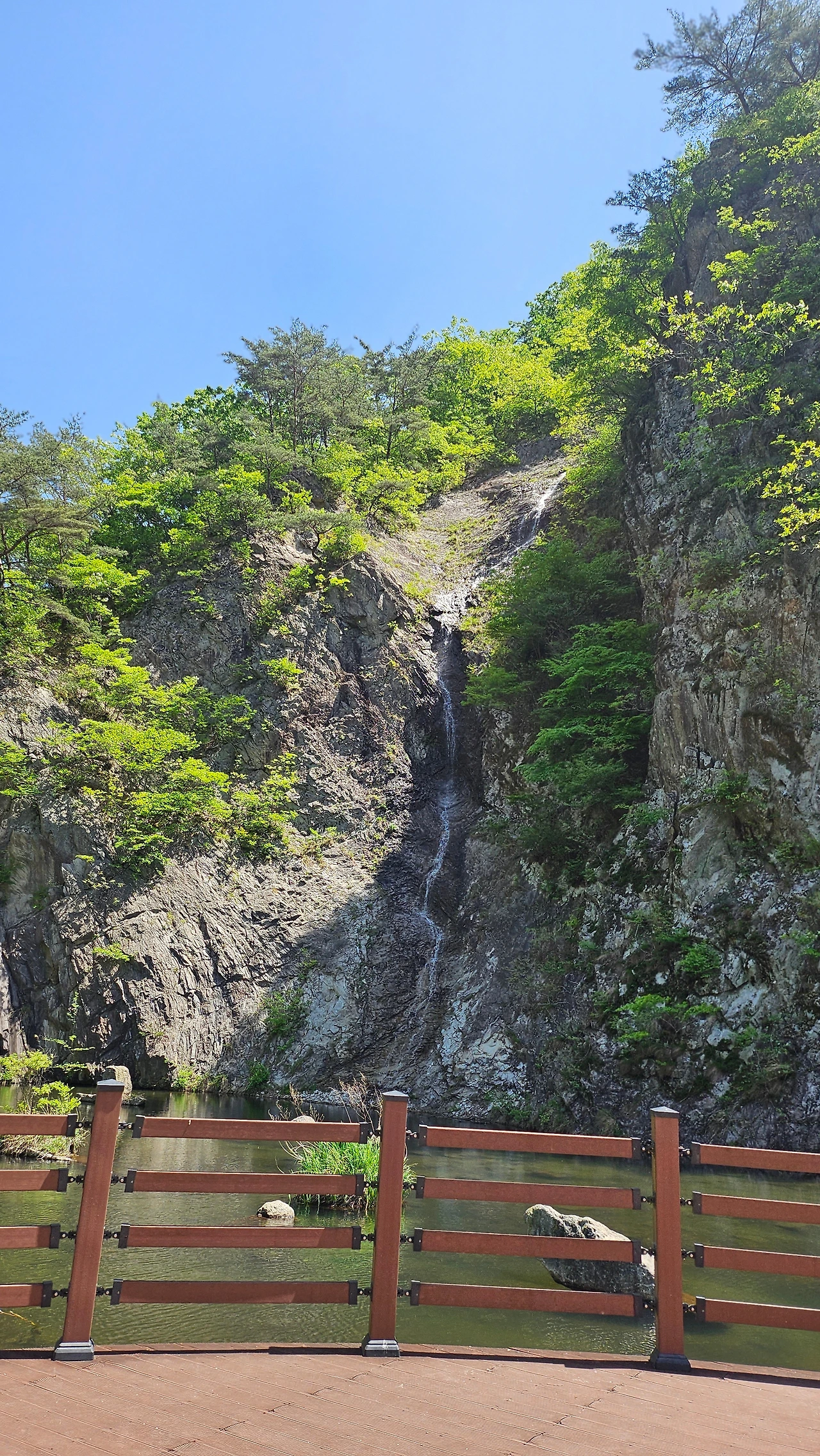 강천산군립공원에 인공적으로 조성된 폭포에서 두 줄기의 폭포수가 분당 6t씩의 물을 쏟아내고 있었다.