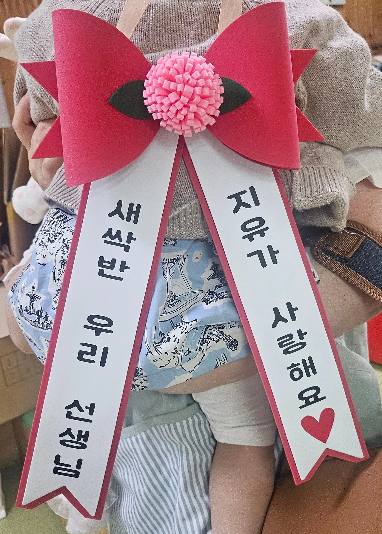 지유는 꽃이 되어 리본을 목에 걸고 왔다.