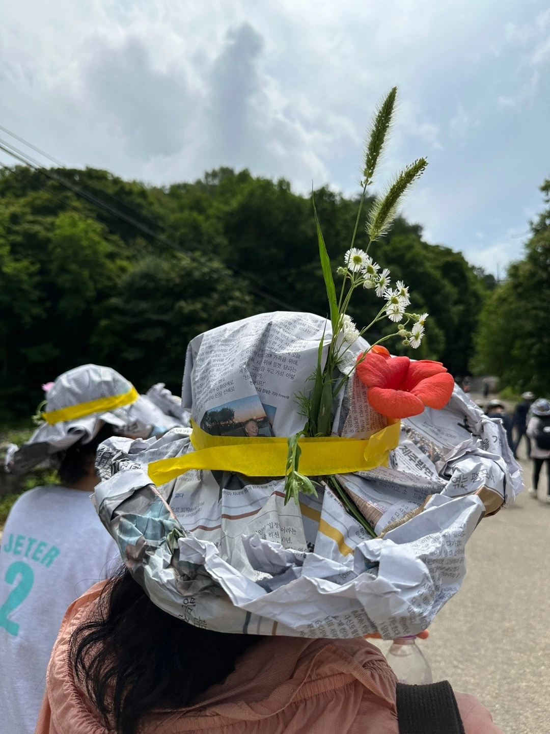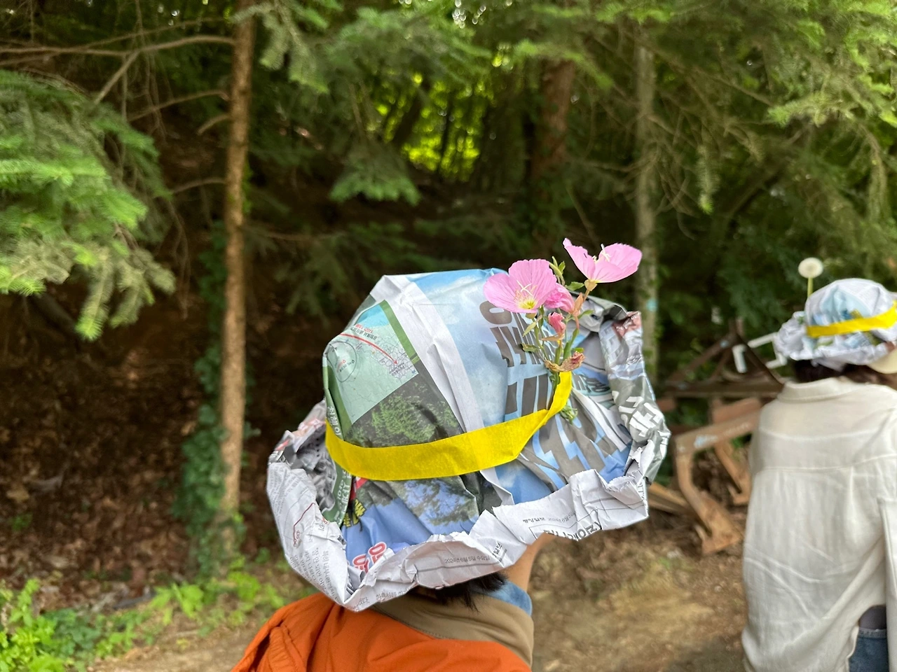 모두 즐겁게 모자를 만들어서 쓰고서 다시 오후 수업을 위해 산으로 출발하였다.