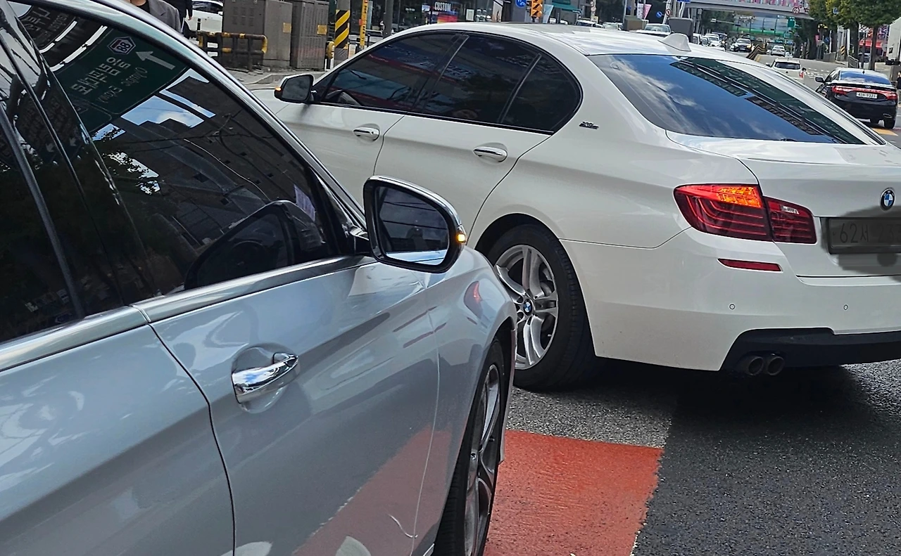 정신을 차려보니 흰색 자동차가 내 차의 오른쪽 범퍼와 앞바퀴를 들이박고 앞쪽으로 나아가더니 주차 브레이크를 당기고 서 있었다.
