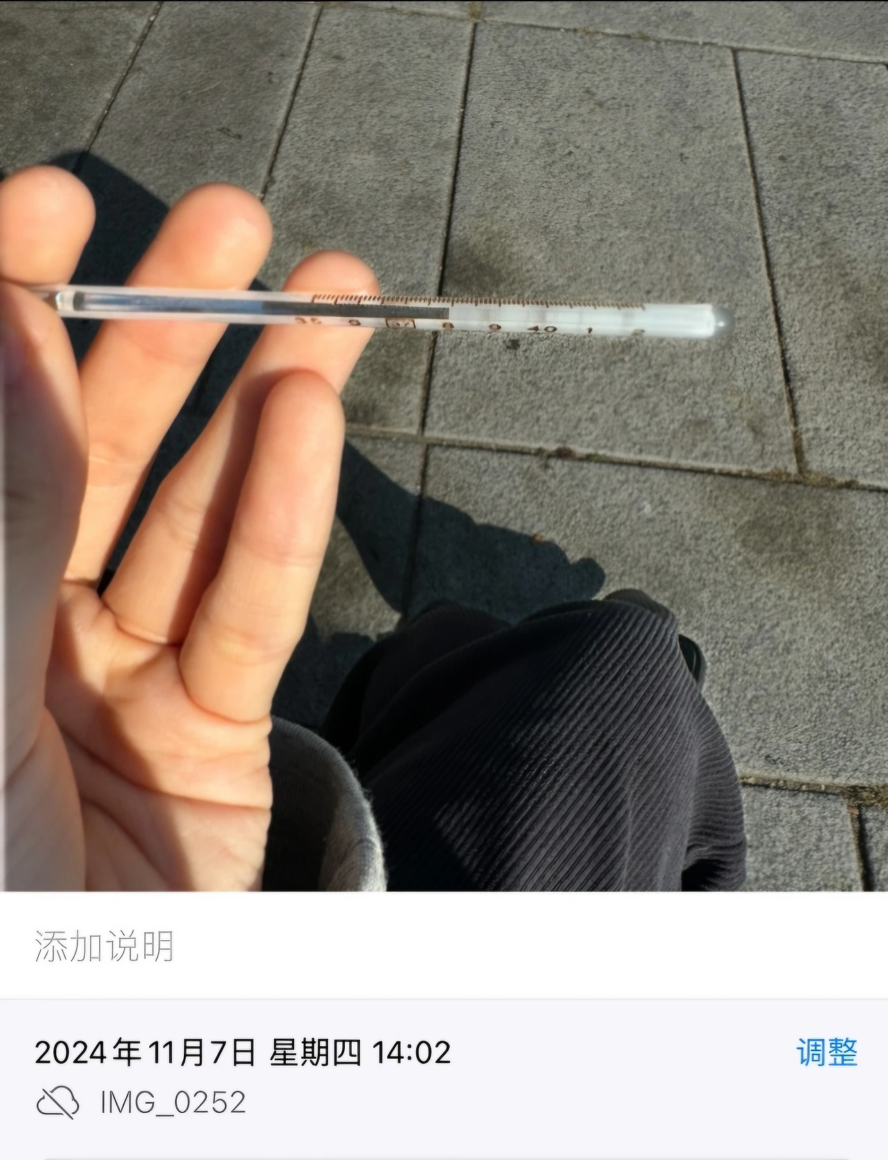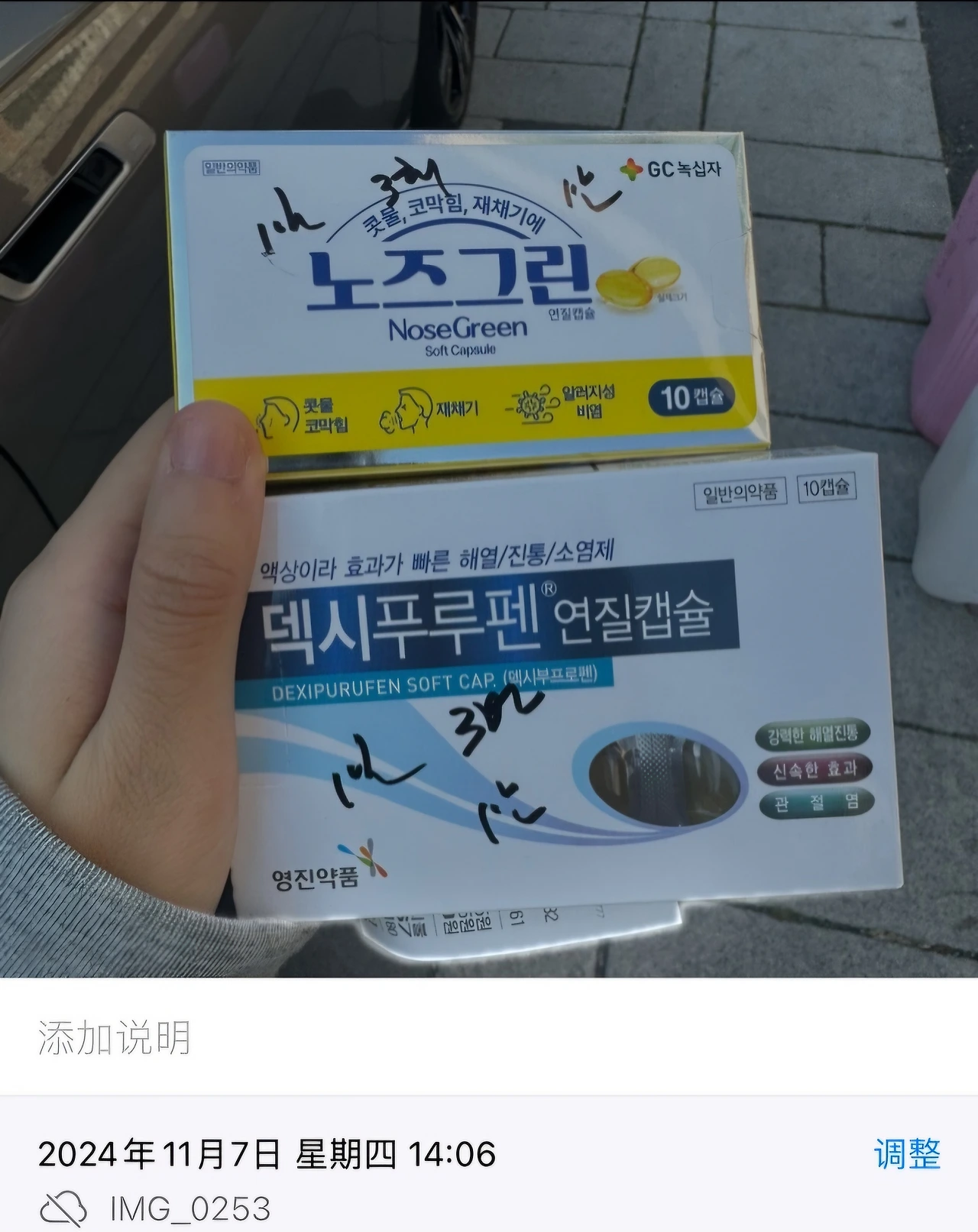 사진에는 체온을 재고 있는 '체온계'와 약국에서 구입한 '종합감기약'이 함께 찍혀 있었다.