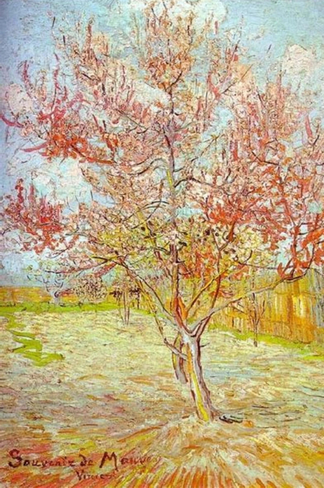 빈센트 반 고흐는 존경하던 화가 안톤 모브의 사망 소식을 접하고, 그를 추모하기 위해 복숭아나무가 꽃핀 풍경을 화폭에 담았다.