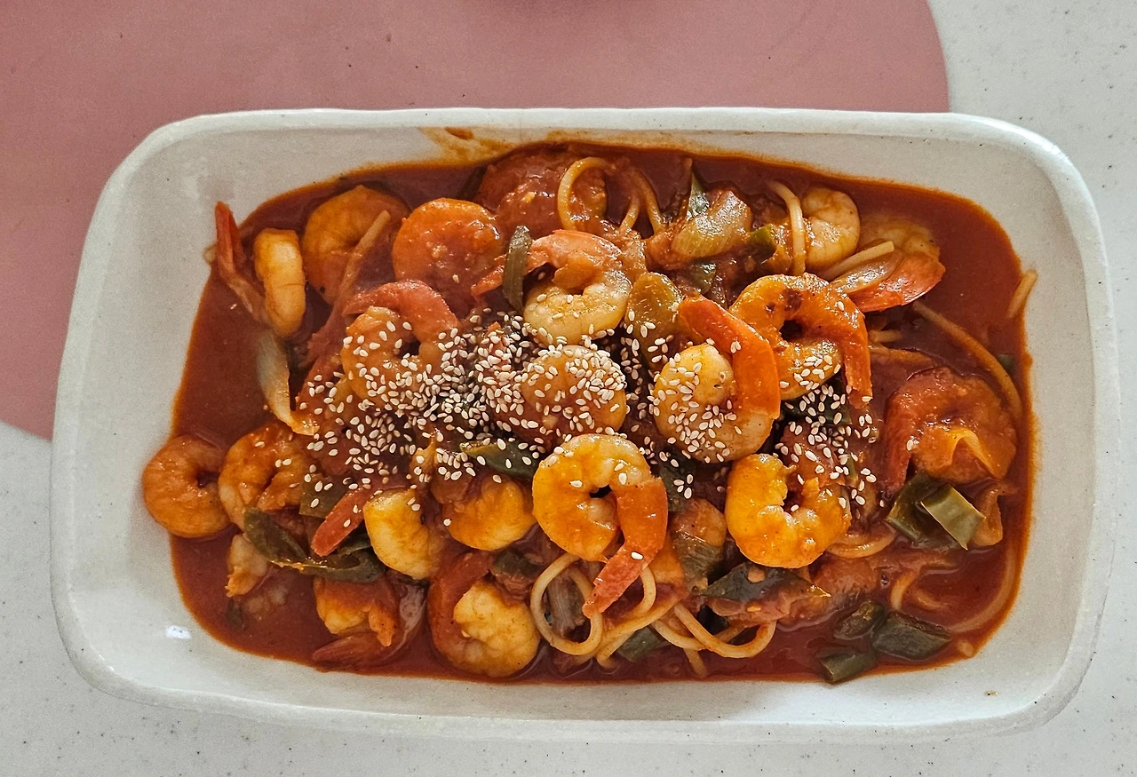 새우가 듬뿍 들어간 매콤하고 따뜻한 새우 해장파스타 한 접시.