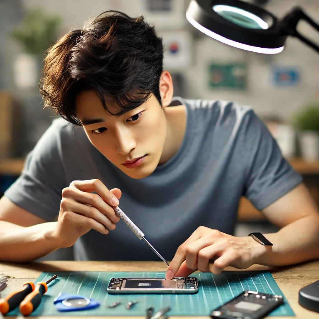 공구를 가져와 깨진 핸드폰에서 유심을 꺼내더니 기존 핸드폰에 유심을 갈아 끼워주었다.