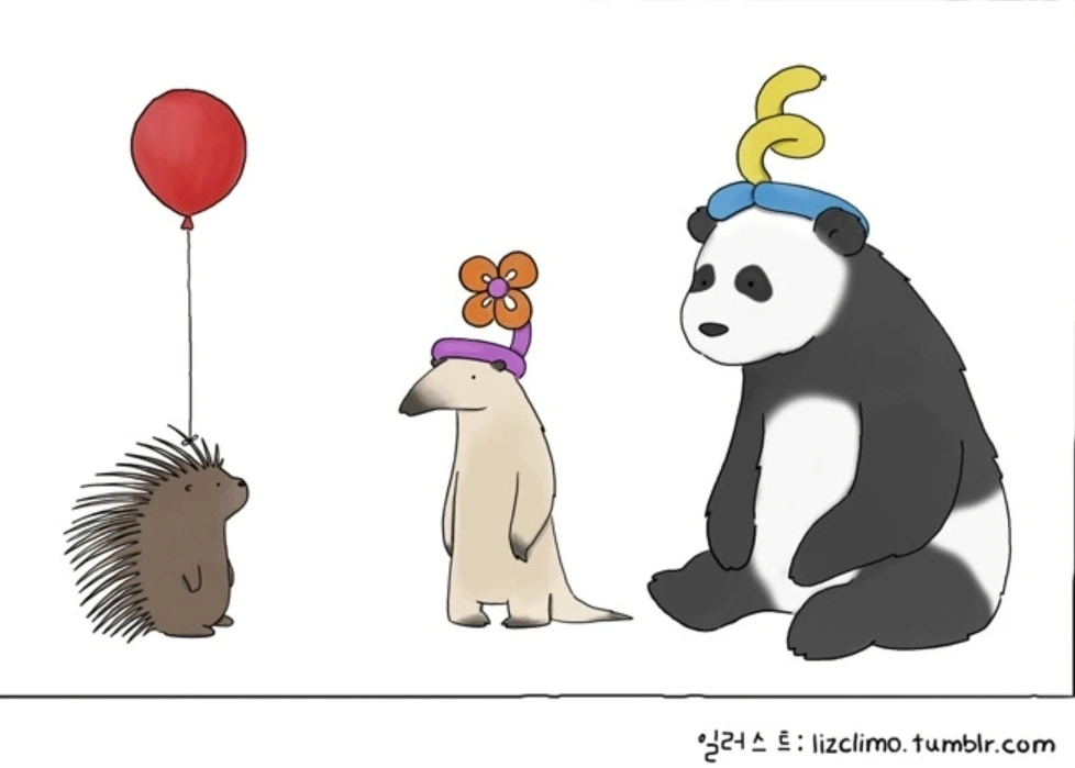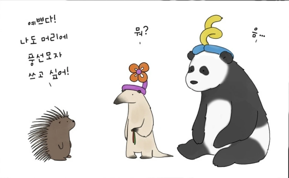 판다와 개미핥기는 아무 문제 없이 풍선 모자를 쓸 수 있지만, 고슴도치는 자신의 신체적 특성인 가시 때문에 그대로 다른 동물을 따라서 풍선 모자를 썼다가는 터질게 뻔했다.