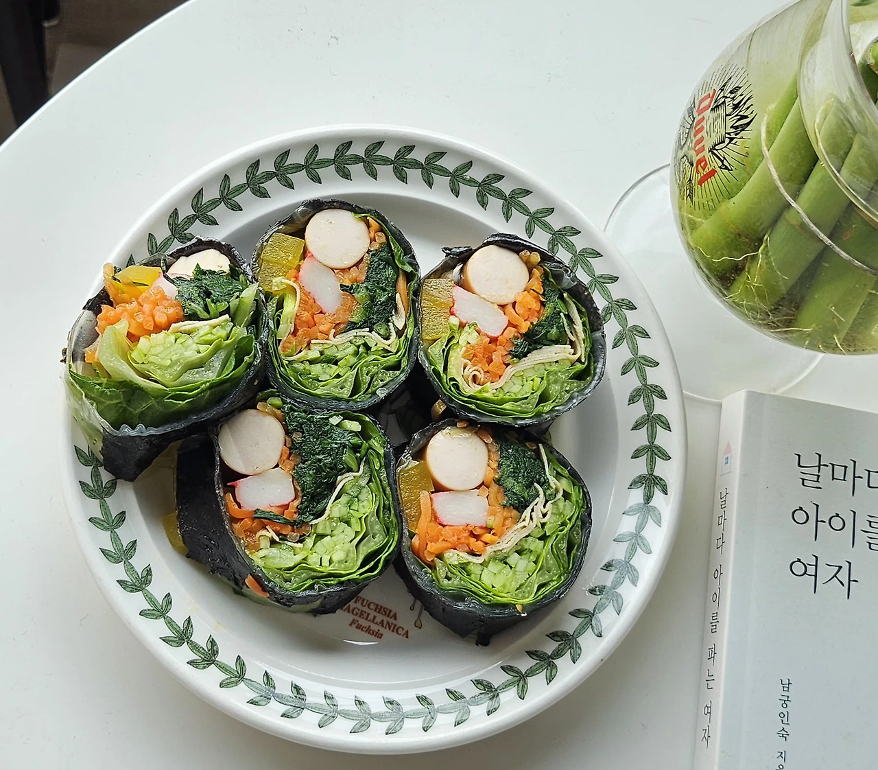 김발도 없이 '밥'대신 '라이스페이퍼'와 김을 한 장 깔고 그 위에 야채 한가득 올려 돌돌 말아 만드는 요리였다.