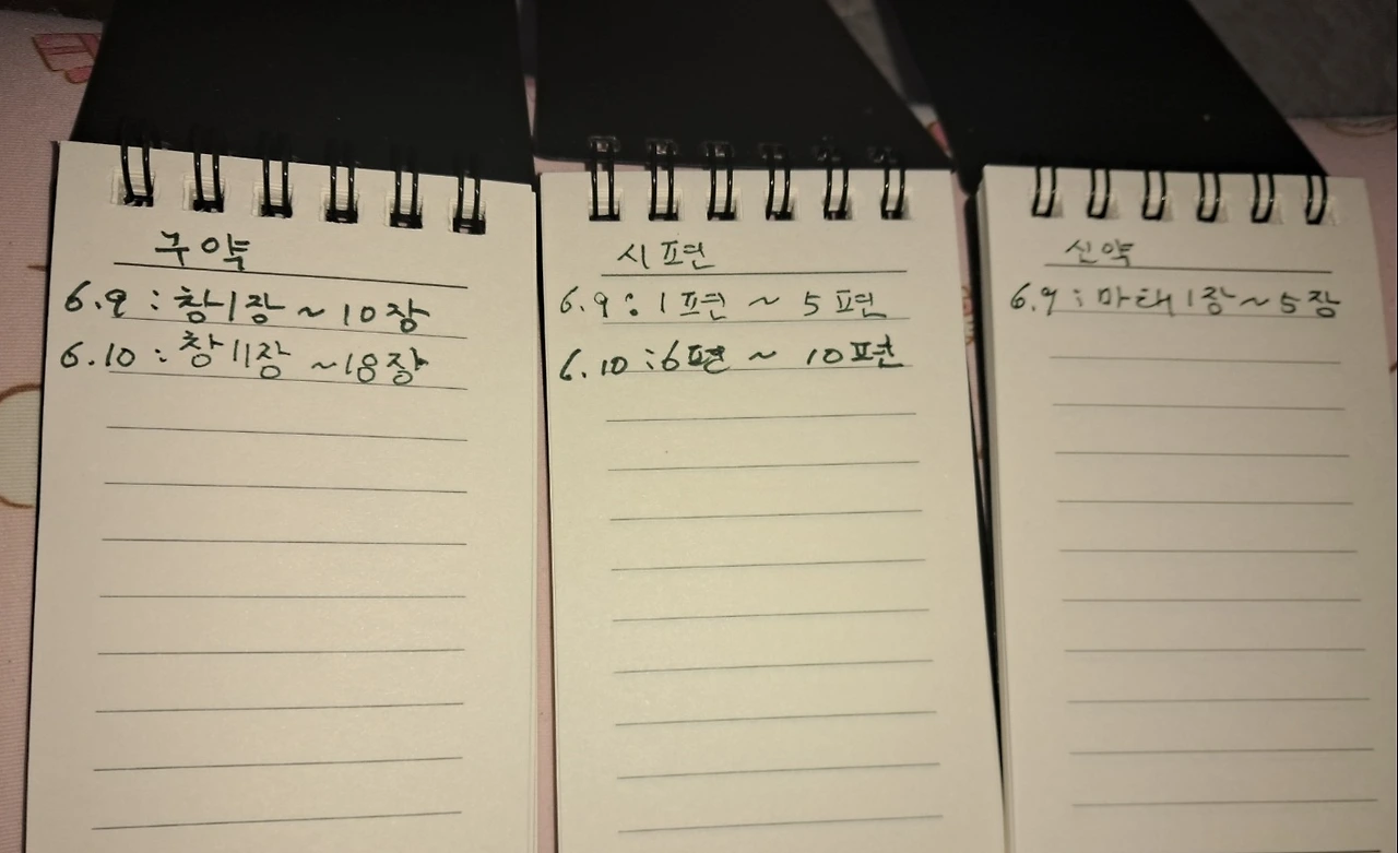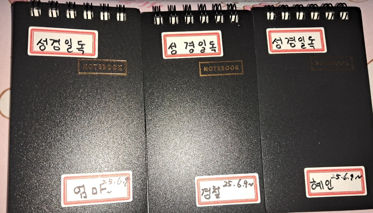 검은 표지 위에 가지런히 붙여진 이름표엔 ‘성경일독’이라는 글자가 적혀 있었고,