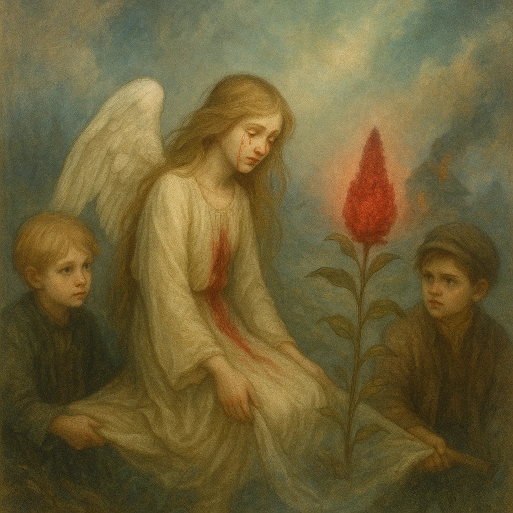 산간 마을에서 두 아이가 피를 흘리는 천사를 발견해 마을로 데려온다.