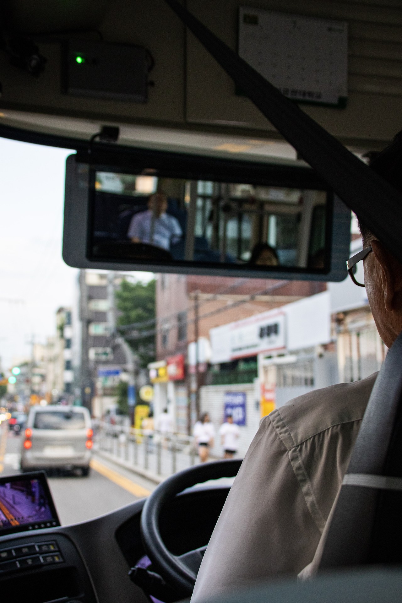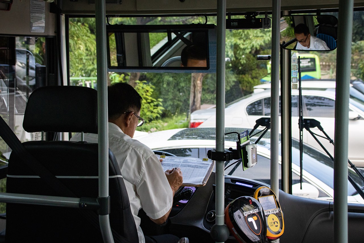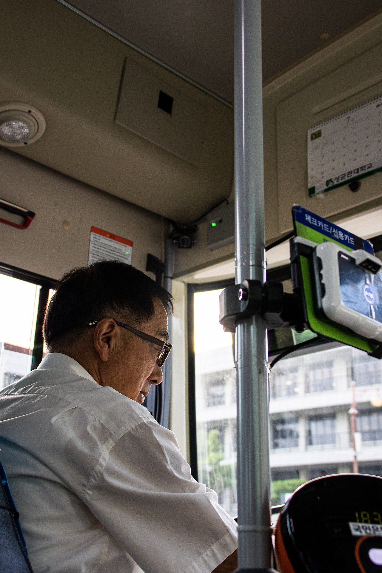20년째, 2004년도 3월 1일부터 오늘까지 계속 셔틀버스를 운전하고 있어요. 내가 이 업을 50대 중반에 시작했다 보니까 지금은 70대 중반입니다. 방학 기간에는 오전 7시부터 오후 1시까지 오전반이, 1시부터 7시까지는 오후반이 나눠서 해요. 학기 중에는 밤 11시까지 운영을 하니 2시간씩 더해서 8시간씩 근무하고. 종점에서 출발해서 16분 내지 17분 정도면 다시 들어오는데, 배차 주기는 30분이라 내려서 휴식할 시간은 안 돼. 그래가지고 계속 차 내에 있어야 하니 지루하기도 해요. 그래도 학생들이 많이 이용할 때는 시간이 잘 가. 인사도 주고받고, 타고 내리고 하는 상황들을 주시하고 신경 써야 하니까.