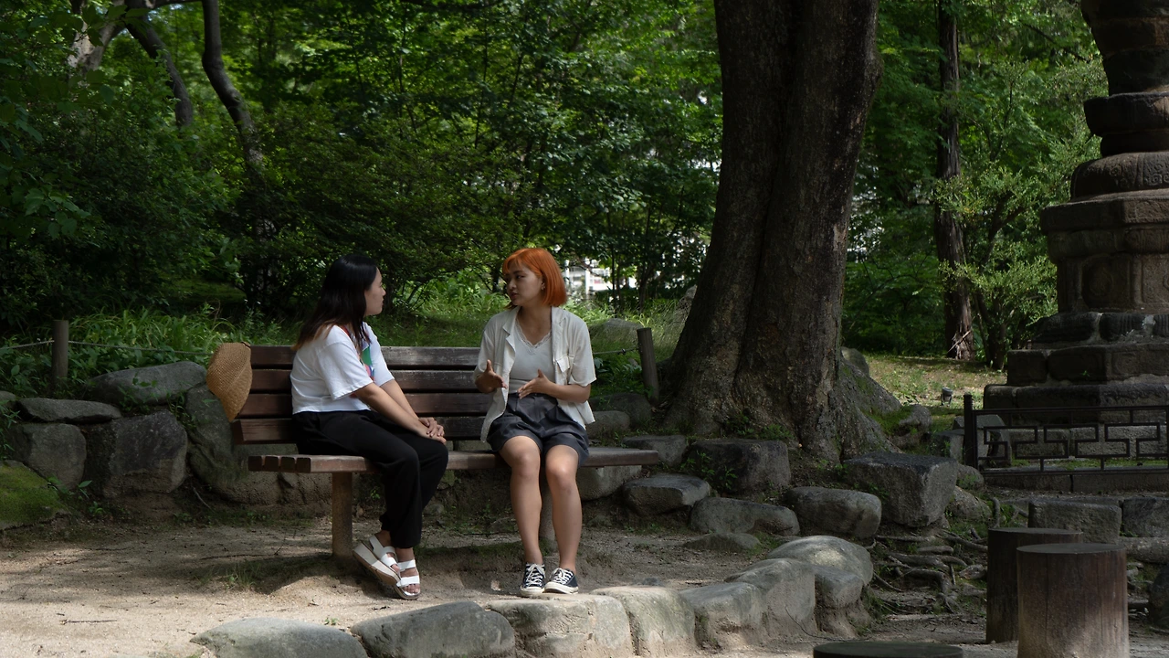 한국의 고궁에서 한국어, 영어, 일본어로 대화하는 한국인과 일본인.