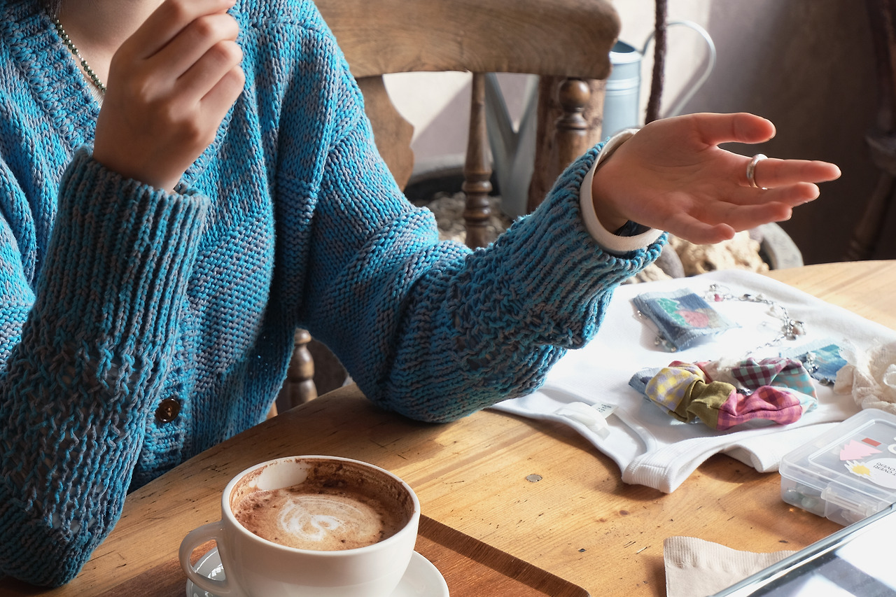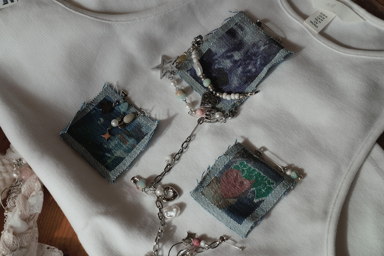 꽂히면 이것저것 만들어봐요. 집에서 프린팅 한 작업물을 어디서 봤는데 너무 신기하더라고요. 그래서 그냥 집에 있는 프린터로 해본 거예요. 여기서 어떻게 좀 다르게 할 수 있을까 찾아보다가, 패치워크랑 비즈로 해봐도 예쁠 거 같아서 동대문에서 비즈 사서 옷 만들고 남은 걸로 액세서리를 만들었어요. 이 안에 들어있는 아트워크도 다 포토샵으로 만든 거예요. 흑백 버전이랑 색감 더 쨍한 버전으로 여러 개 해보는 과정이나 실제로 인쇄되어서 나오는 게 너무 재밌더라고요. 결과물이 내가 상상한 것과 비슷하게 만들어지면 되게 기분 좋아요.