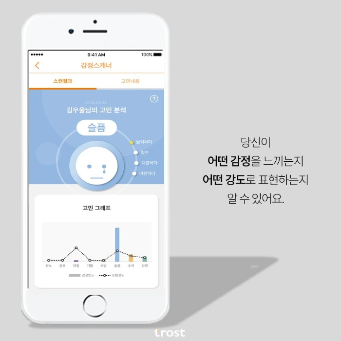 우리는 건강한 마음이 행복한 삶을 만든다고 믿는다. 트로스트는 전문 심리상담 서비스를 모바일 메신저로 구현해 더 많은 사람들이, 늦지 않은 때에, 부담 없는 환경과 가격으로 상담을 받을 수 있게 한 서비스이다. 우리의 관심은 계속해서 정신건강관리의 장벽을 더 낮추는 데에 있다. 이러한 맥락에서 최근 런칭한 '감정스캐너'는 사용자가 고민을 작성하면 머신러닝 기술을 기반으로 고민 속 감정을 분석해주는 솔루션이다. 꼭 상담을 받지 않더라도, 일상에서 자신의 감정을 이해하고 관리하게 하고자 하는 데 목적이 있다.