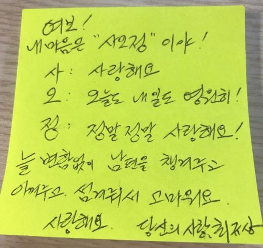 어느 날 아침 출근하는 현관에서 아내에게 눈을 감으라 하고 손 위에 포스트잇 쪽지를 살포시 올려줬습니다. 돈봉투도 아닌 조그만 쪽지였을 뿐인데 슬쩍 읽어본 아내는 아이처럼 좋아합니다. 오랫동안 유머를 주고받다보니 뭔가 새로운 표현방법이 없을까 궁리하다 창조(?)한 것입니다. 아내의 반응이 생각보다 좋아서 오랫동안 즐길 수 있을 것 같았습니다.