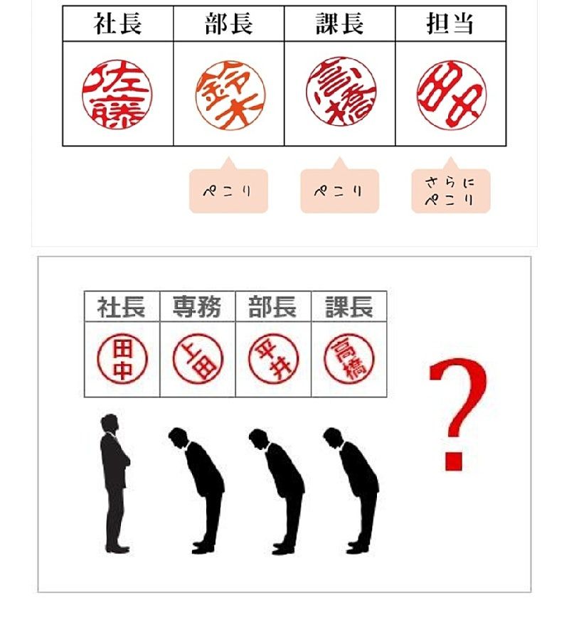 그리고 결재판에 도장을 찍을 때 왼쪽으로 살짝 기울여서 도장을 찍는 문화가 있는데, 이는 윗사람에게 존경을 표시하며 고개를 숙이는 메타포라고 한다. (진짜 놀랍지 않은가? 그래서 또 일본에서 일하는 HJ상에게 물어봤다. 일부 회사에서는 진짜 그렇다고 한다!!)
