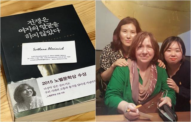 오른쪽 사진은 번역가 박은정 님과 스베틀라나 알렉시예비치 작가님, 그리고 이연실 편집자님. (출처: 한국일보)