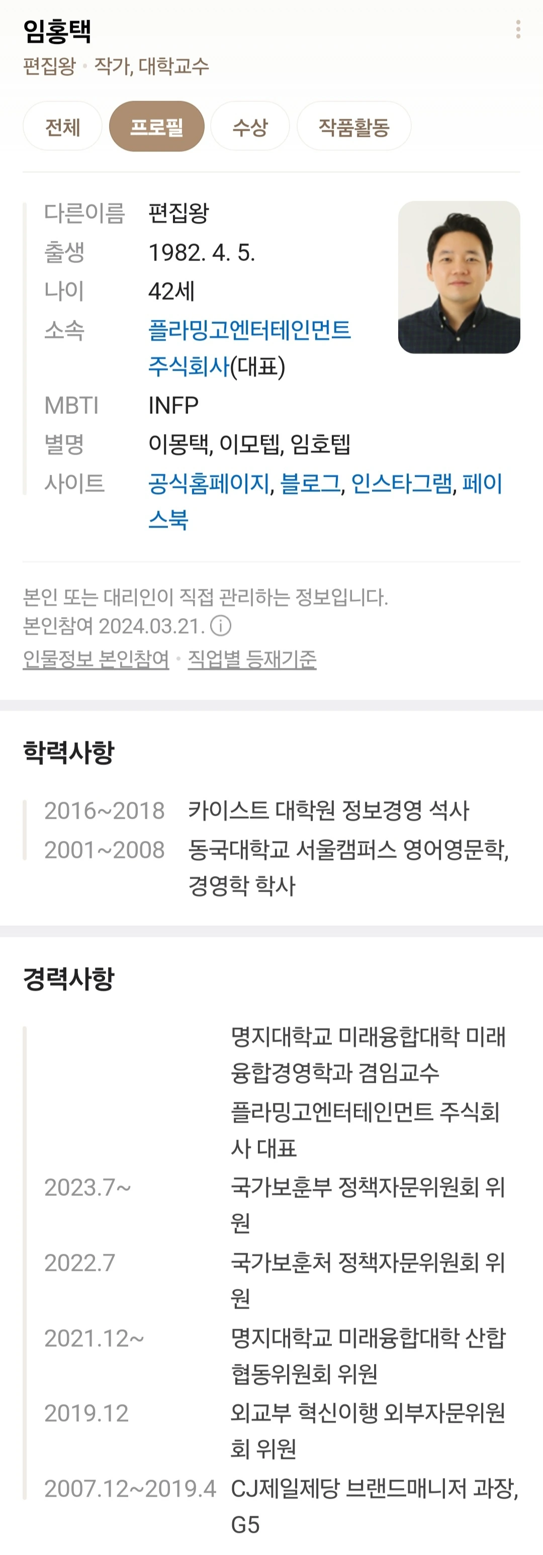 임홍택 작가님은 나를 모르지만, 나는 그분을 잘 안다. (이런 게 셀럽인가 보다) 기사를 통해 작가님이 새로운 책을 준비하고 있고, 잘 나가던 CJ를 때려치우고 더 잘 나가게 되었다는 것을 알았다. 그래서 프로필을 검색해 보니... 진짜 넘사벽이 되었다. 창업도 하시고, 교수도 하시고...