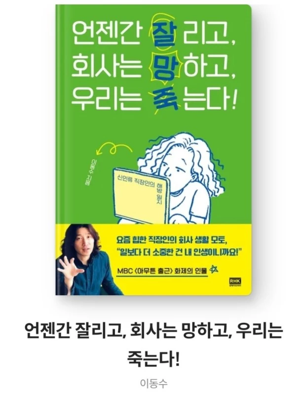 이동수 작가님은 <언젠가 잘리고, 회사는 망하고, 우리는 죽는다!>를 직장 생활 모토로 삼았고, 이 주제로 책까지 발간했다. 그렇다면 살짝 비틀어, <나는 내일 당장 잘릴 수 있고, 회사도 언제든지 망할 수 있고, 우리는 죽긴 하겠지만 언제 죽을지는 모르겠다!>고 가끔 생각해 보면 어떨까? 나의 경쟁력은 결국 나만이 챙길 수밖에 없기 때문이다.