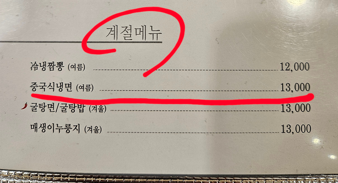 그렇다. 그 시절에만 쓸 수 있는 글이 있듯, 별다를 게 없는 직장인의 점심 같지만 그 시절, 그 계절에만 먹을 수 있는 메뉴가 있다. 나에게는 '중국 냉면'이 딱 그렇다. 중국 냉면은 오직 여름에만 먹을 수 있는 계절 한정 메뉴이기 때문이다. 물론, 한국에 있는 어느 중국집에서는 분명 동지에도 중국 냉면을 판매하는 집도 있겠지만, 내 주위의 중국집에서는 오직 여름 한철만 중국 냉면을 판매한다.