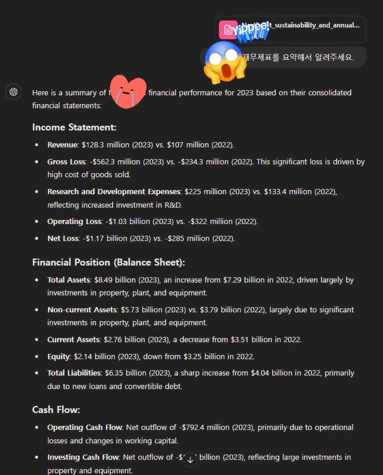 - 그래서 직진으로 120쪽짜리 영문 보고서를 ChatGPT에 욱여넣었다. 그리고 당당하게 부탁했다. '분석해 줘!!!' 마치 33개월 된 내 아이가 나한테 요구하듯.