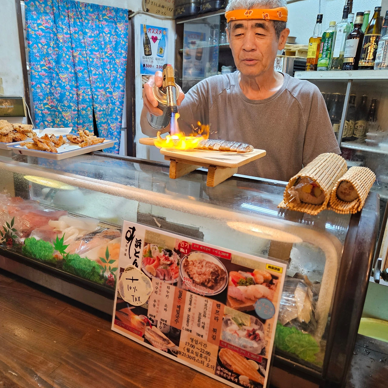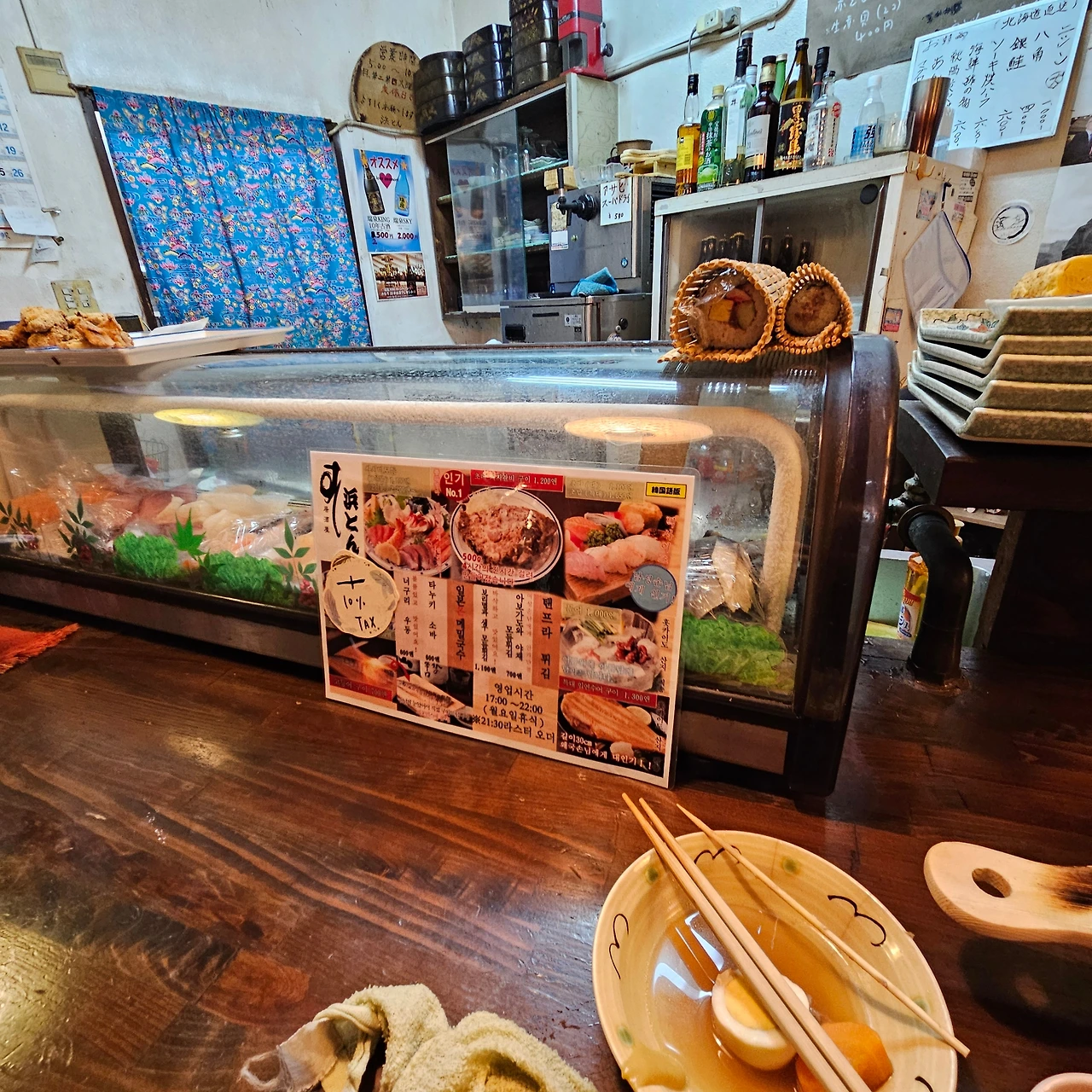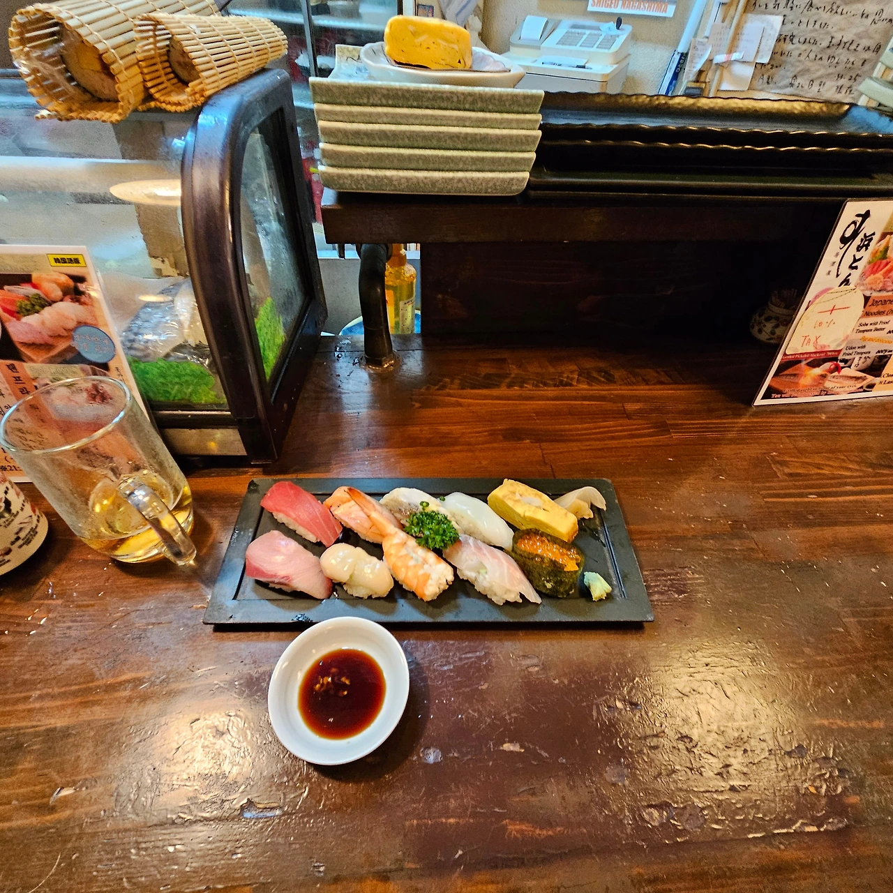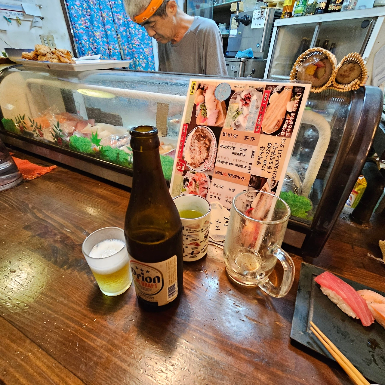 선택은 틀리지 않았다. 노부부로 보이는 어르신 두 분이 운영하는 듯 보였는데, 10석 정도의 다찌와 3개 테이블로 구성된, 오래되었으나 가지런한 일본의 여느 초밥집이었다. 음식도 훌륭했다. 나는 고등어구이와 모둠 초밥 그리고 아사히 생맥 2잔 + 오리온 병맥주를 혼자서 진짜 혼자서 시켜서 먹고 마셨다. 사실 맥주가 너무 맛있어서... 안주를 더 시켰다. 아니, 안주가 더 맛있어서 맥주를 더 시킨 것일지도...