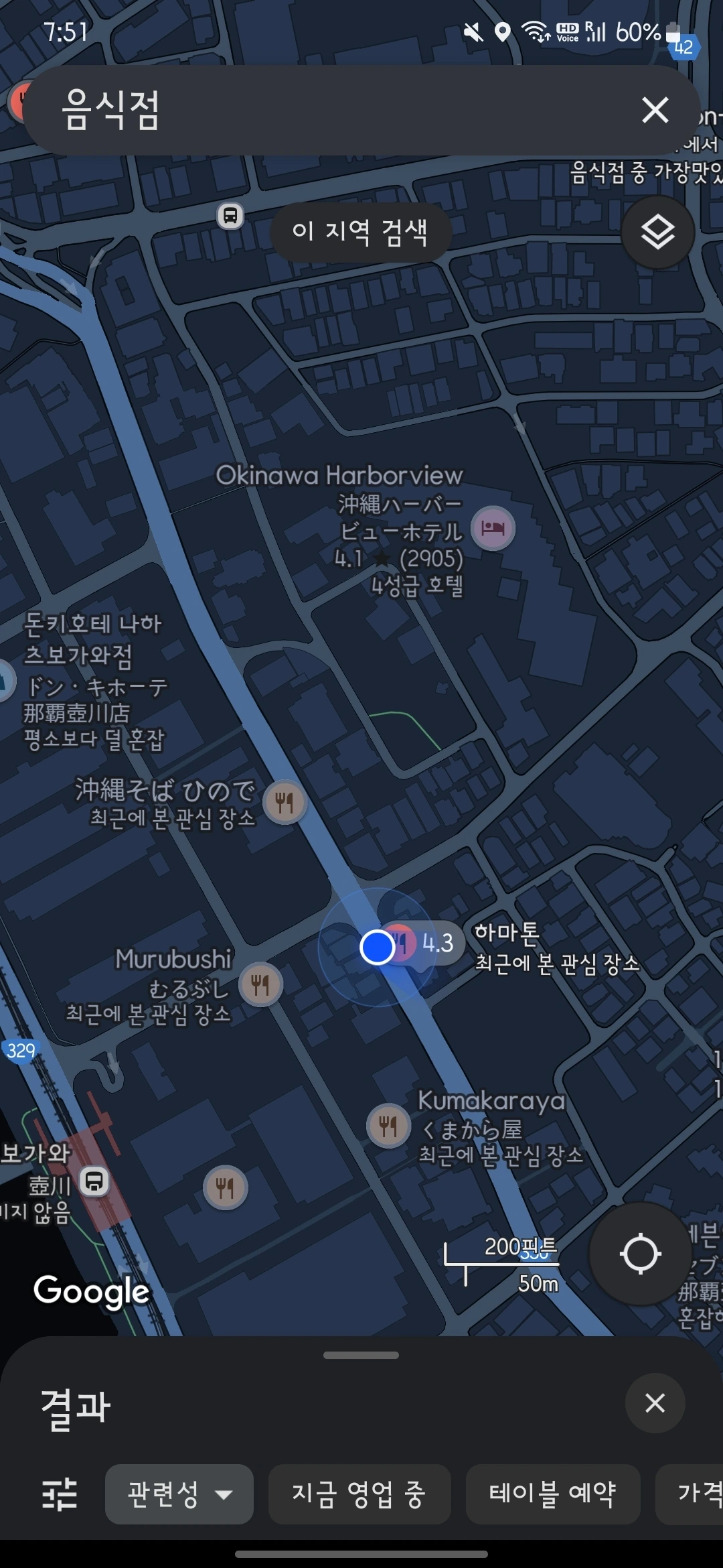 나는 침울한 표정을 지은채(이런 상황에서는 표정이 아주 중요하다) 혼자 터널터널 방을 나왔다. 호텔 문을 나서자마자 기운이 살아난 나는, 구글지도를 풀 검색 하기 시작했다. 동시에 두뇌도 풀가동하기 시작했다. 오키나와에서 혼자서 저녁이라니!!! 완전 개이득.
