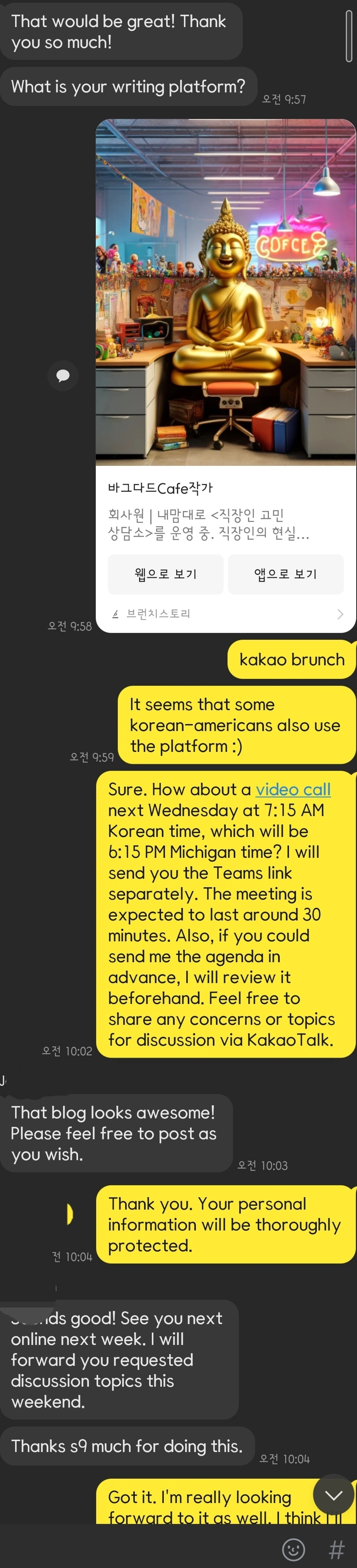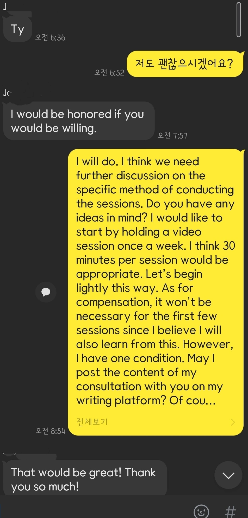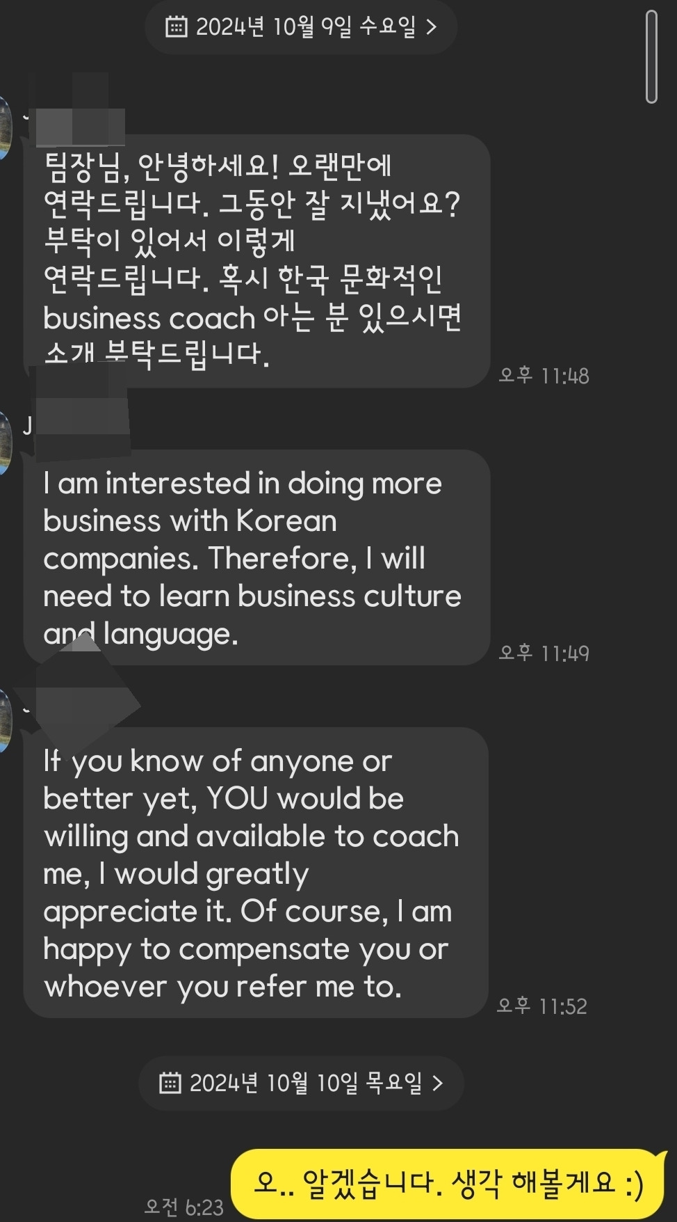내용을 요약하자면, 형님이 미국에서 한국 관련 비즈니스를 더 확장하고 싶은데, 아무래도 본인은 미국태생이니 한국 비즈니스 문화에 대한 이해도가 떨어짐으로 이에 대해서 조언해 줄 사람을 찾고 있다는 것이었다. 형님께서 나를 좋게 봐주셨는지 'YOU(나)'가 해줘도 좋겠다고 강조했다. 그리고 적절한 보상도 해주겠다는 제안이었다. 사실 형님께서는 2년 전에도 비슷한 얘기를 나한테 했고, 이제 본격적으로 실행에 옮겨야겠다고 결심한 듯 싶었다.