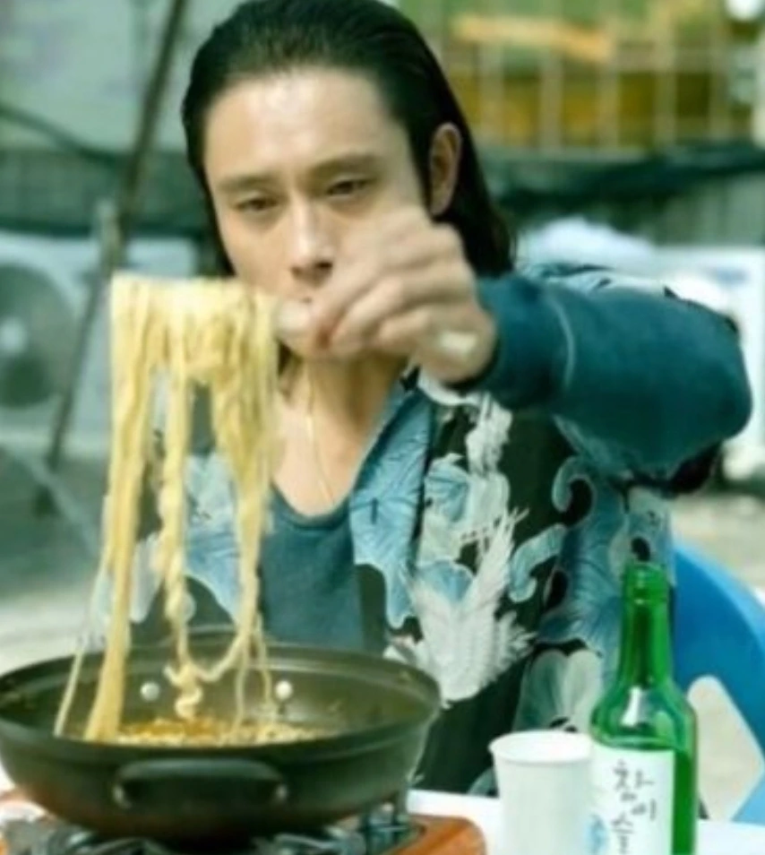 <영화 '내부자들'에서 안상구가 왼손으로 라면을 휘휘 돌려 먹는 장면. 아마 엄청 뜨거웠을 것이다>