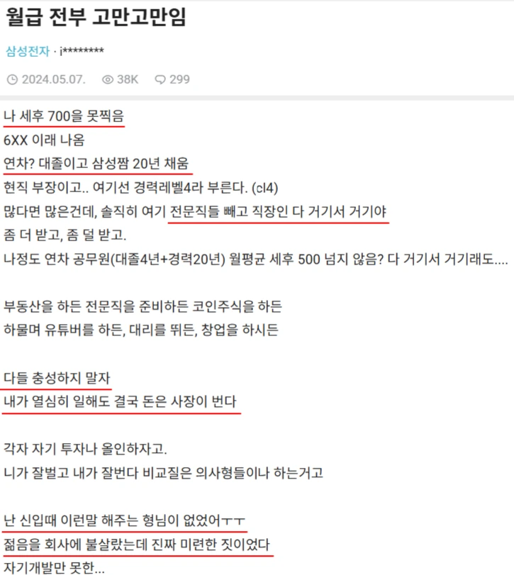 직장인 익명 게시판에서 세후로 월 6XX만원 받는 삼성전자 현직 부장님(줄여서 '삼부장')의 글을 읽었습니다.