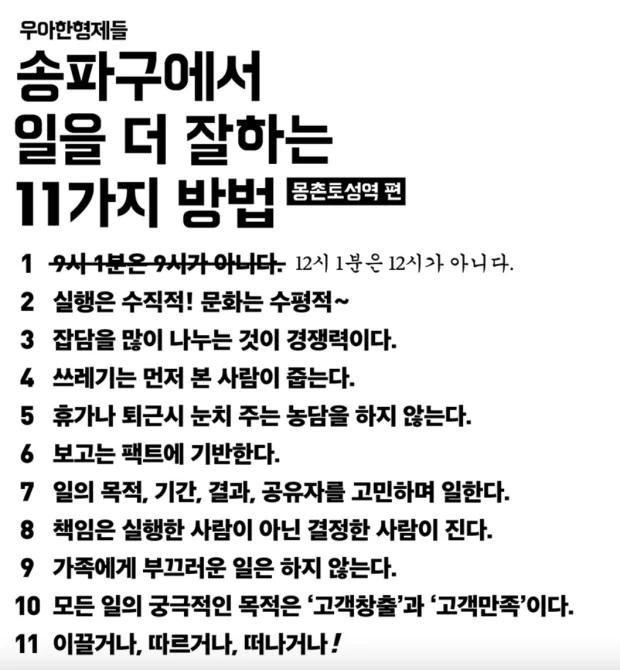 후배의 이직을 보며, 혁신으로 성장한 기업이 규모를 갖추고도 혁신을 유지할 수는 없는지 의문이 든다. 몇 해 전, 우아한형제들의 일하는 방식인 <송파구에서 일을 더 잘하는 11가지 방법>을 보고 충격을 받았드랬다. 다시 한 번 읽어본다. 그리고 내가 가야할 우아한 방향에 대해 다시 고민해본다.