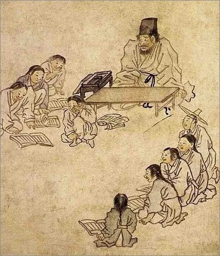 김홍도의 풍속화 <서당>. 조선시대 서당에서는 나이와 상황과 신분도 각기 다르지만, 학습 수준에 따라 모여서 공부를 했다고 한다.
