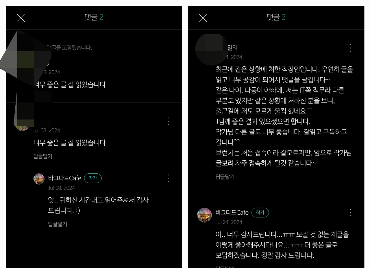 아직 브런치 운영 초반이라 댓글이 많이 없지만, 그래도 몇몇 K직장인께서는 공감과 위로를 얻어 가는 것 같다. 감사합니다.