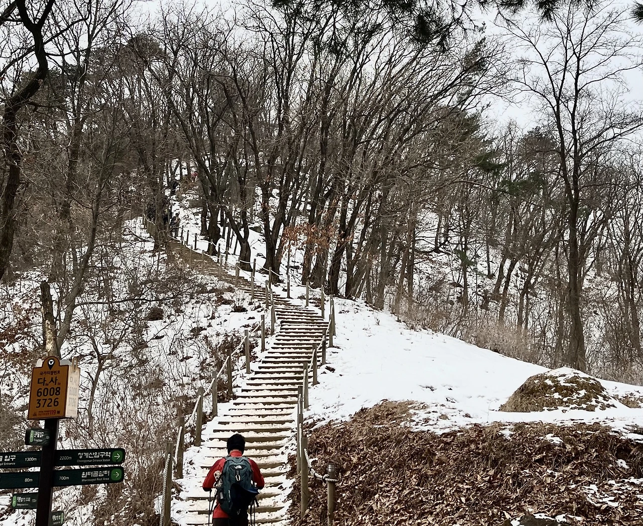 끝없이 이어진 눈덮인 계단을 밟으며, 출발 직전의 위풍당당했던 발걸음은 이미 온데간데 없고, 매봉까지 어떻게 나아가지 싶은 막막함과 아찔함만 마음에 가득했다. 대학교 3학년이 되자마자 늘어가는 전공수업의 압박과 진로에 대한 걱정이 동시에 겹쳤다고 할까? 아직 갈 길은 먼데 벌써 숨은 가빠오고 머리는 어지러웠으며, 두 다리는 떨리기 시작했다. 아직 녹지 않은 계단을 디딜 때마다 미끄러워 넘어질 것도 같았다.