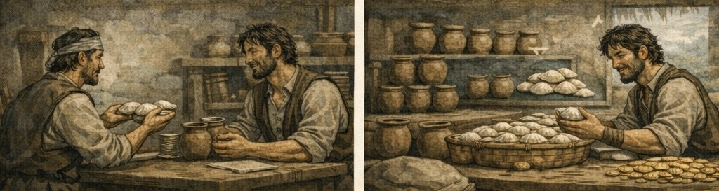 어느 날 물고기를 갖은 사람과 창을 갖은 사람이 서로 교환하는 게 보인다. 창을 받은 사람은 그걸로 물고기를 더 잡고 물고기를 받은 사람은 힘을 얻어 창을 더 만든다.