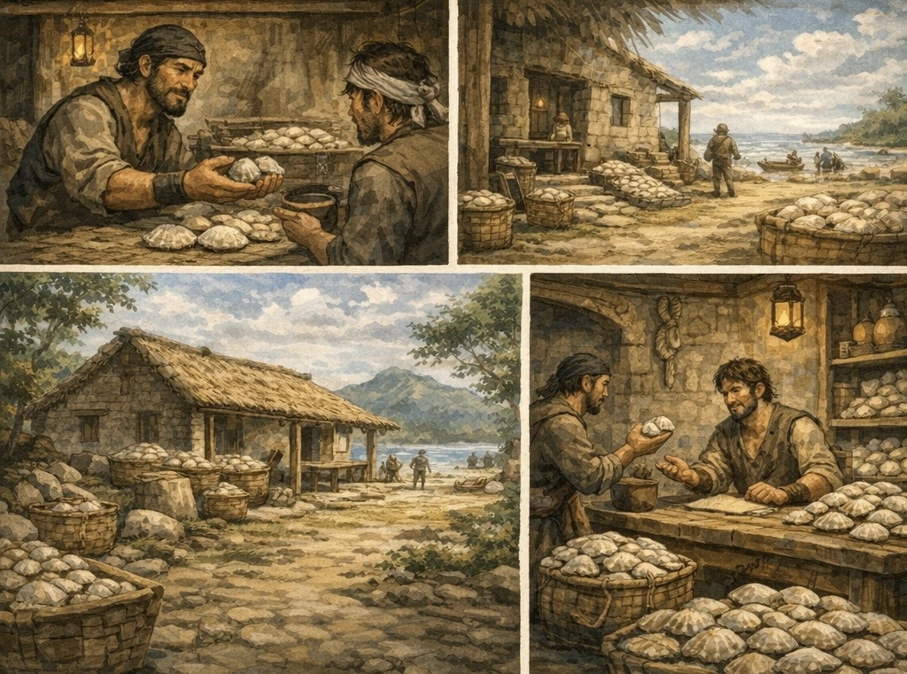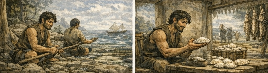 이제 배를 타고 멀리 나가 여러 종류의 많은 어류를 잡았고, 더 이상 필요한 게 없기에 나중을 위해 무조건 조개껍질로 받아두었다.