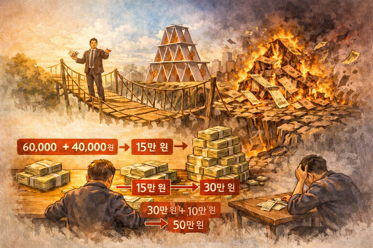 이제 30만 원을 가지고 다시 제안이 들어온다. 내 돈 10만 원만 더 보태서 40만 원으로 일을 해보라는 것이다. 더 크게 벌 수 있다고, 이번에는 확실하다고 말한다. 그리고 실제로 숫자는 다시 커진다. 40만 원으로 시작해 50만 원이 된다.
