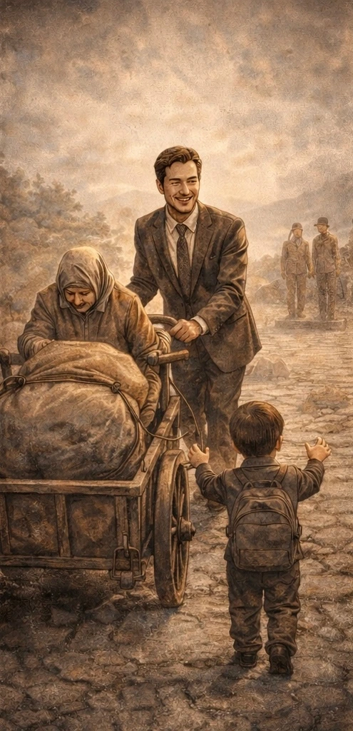 할머니와 주변에 잘 보이기 위해 앞에서 돕는 척하지만 실질적인 도움보다는 이미지 관리에 집중한다.