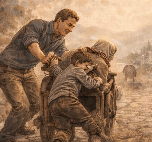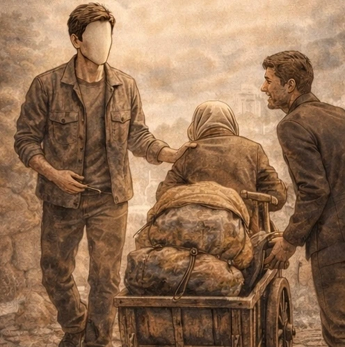 무거운 짐을 실은 수레를 끌고 언덕을 오르는 할머니가 있고, 그 뒤에서 어린아이가 힘겹게 밀고 있다.