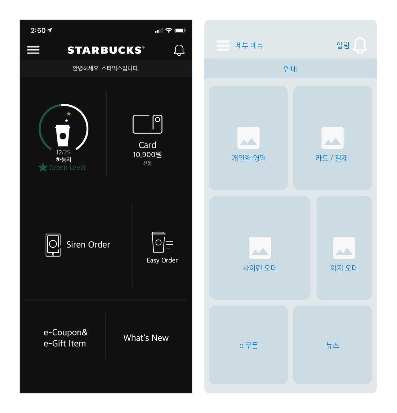 스타벅스 앱의 경우 대부분이 영어로 쓰여있는데, 이해하기 힘든 문장은 친절하게 우리말로도 작성되어 있다. 왜 영어로만 작성되었는지 궁금하다.