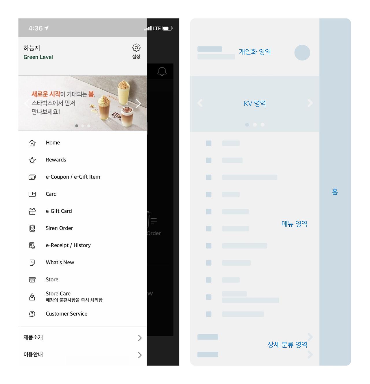 스타벅스 앱의 경우 사람들이 자주 사용하는 메뉴의 경우 메인화면에서 런쳐 형태로 노출을 하고, 그 외 자주 사용하는 메뉴의 경우 Drawer 형태의 메뉴로 보여주고 있다. 그 외에 세분화된 메뉴의 경우 페이지를 이동해서 다시 상위 분류를 보여주고, 다시 페이지를 이동하여 하위분류를 보여주는 형태로 진행되고 있다.