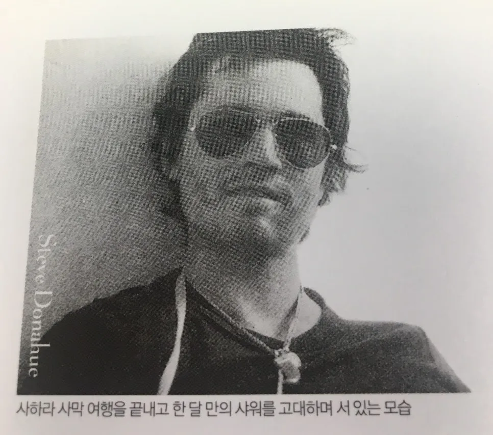 문득 스티브 도나휴의 사하라 횡단기, 『사막을 건너는 여섯 가지 방법』이 떠오른다. 여행을 마치고 한 달 만의 샤워를 기다리던 저자의 사진. 나도 집에 가면, 아부다비 여행을 끝내고 하루 만의 샤워를 고대하며 서 있는 내 사진을 찍고 싶다. 헛웃음이 나온다. 다행히 주유소 간판이 점점 커진다. 대기 차량도 없다.