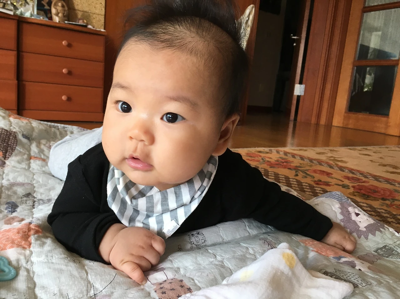그리고 최근에는 정말 가만히 누워있지 않고 뒤집는데, 잘 때도 마찬가지다. 아무래도 뒤집는 게 질식의 위험도 있다고 하니 신경이 많이 쓰이는데, 잘 때 뒤집는 건 특히 걱정이다. 6개월 즈음에 다른 방에서 재우는 것을 목표로 했는데 지금 같이 뒤집고, 다시 되집기를 하지 못하면 따로 잘 수 있으려나 모르겠다. 허허.. 안되면 마는 거지 뭐...