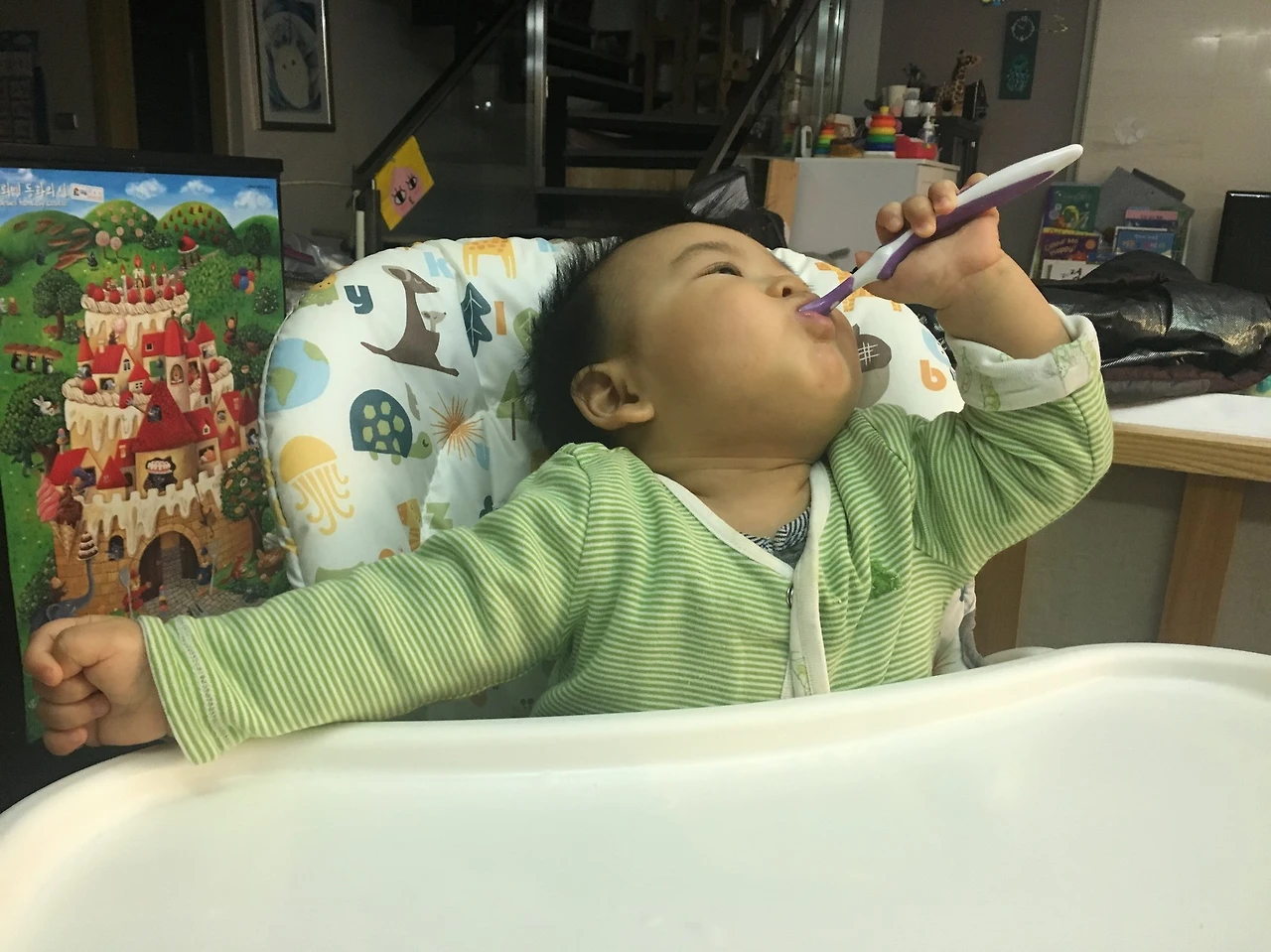 그러나!!! 그리고선 바로 이유식 먹는데 막 울고 불고 난리 부르스를 떠는 바람에 결국 이유식은 반밖에 못 먹었다. 아무래도 좀 졸리고, 오래 앉아 있다 보니 뿔이 난 듯.