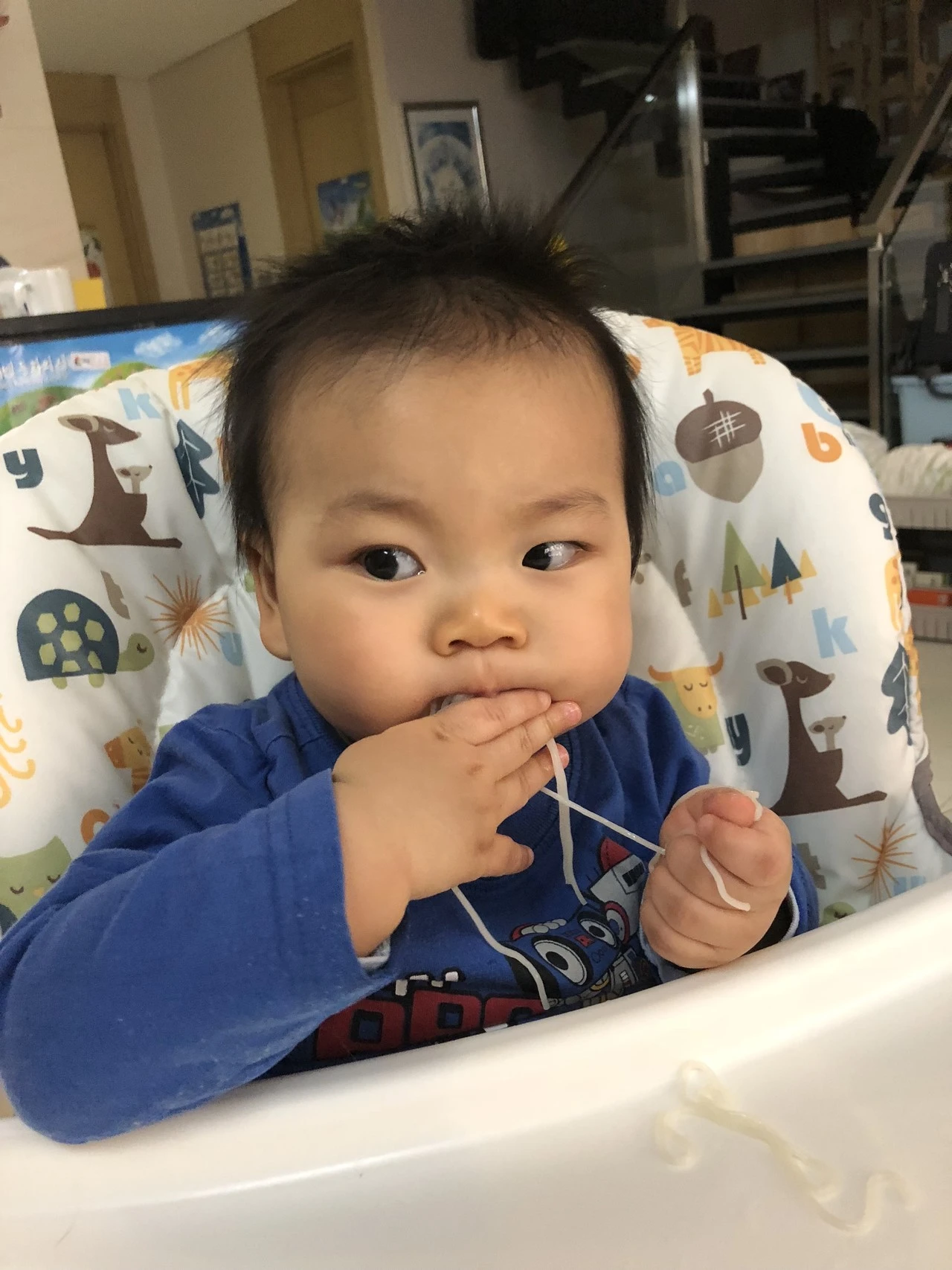 토요일은 와이프 병원이 있어서 또 도하랑 둘이 있었다. 한참을 놀아주다가 점심 먹을 때에 국수를 삶아서 나도 먹고 도하도 국수로 놀이시켜 주려고 했다. 국수 삶아서 나 비빔국수 해서 먹을 동안 국수로 잘 놀았다! 후후 엄청 귀여웠다.