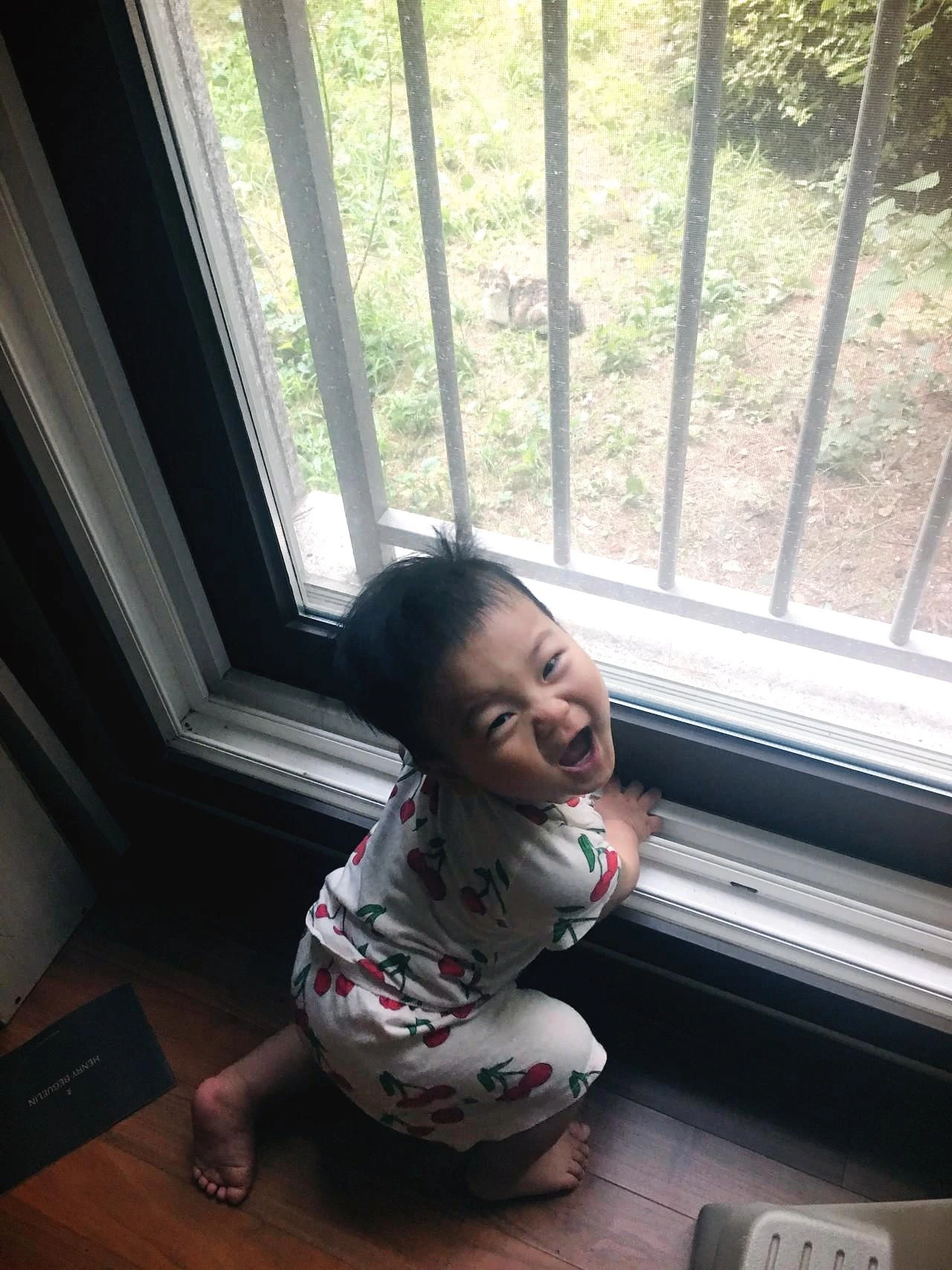 금요일쯤이었나? 아침에 도하가 놀다가 안전 펜스랑 같이 앞으로 넘어졌는데, 살짝 쿵~ 했다. 다행히 하나도 안 아프게 넘어지고 의연하게 일어나선 나에게 말을 걸었다. 자기 넘어졌는데, 의연하다고. 계속 펜스를 가리키고 넘어진 곳을 가리키는데 너무 귀여웠다.