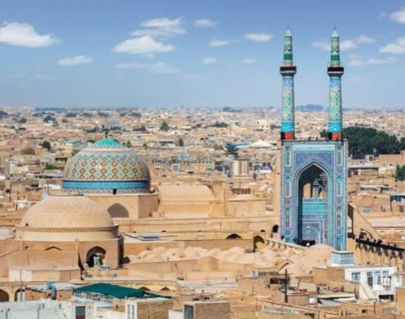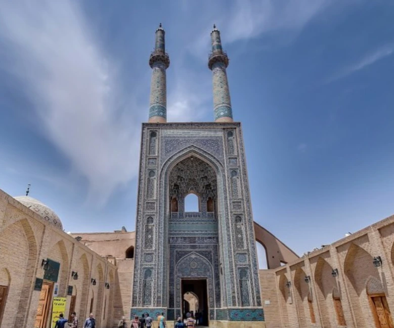 이란 중부 국토의 정중앙에 위치한 야즈드(Yazd)시는 이슬람 전파이전 페르시아 왕국의 국교였던 조로아스터교의 중심지다. 현재는 약 5만명 남짓의 신자가 남아있지만 아이러니하게도 1979년 이슬람 혁명 이후 신자들에 대한 탄압과 차별이 그나마 개선되었다고 한다. 근처에 위치한 이스파한의 대(大)모스크와 마찬가지로 이곳의 대모스크(Masjid-i Jami’)도 과거 조로아스터교 사원 자리에 지어졌다. 황갈색의 낮은 주택들 너머로 보이는 모스크의 푸른 지붕과 두개의 우뚝 솟은 52미터의 미나렛(첨탑)이 멀리서도 엄청난 존재감을 자랑한다.
